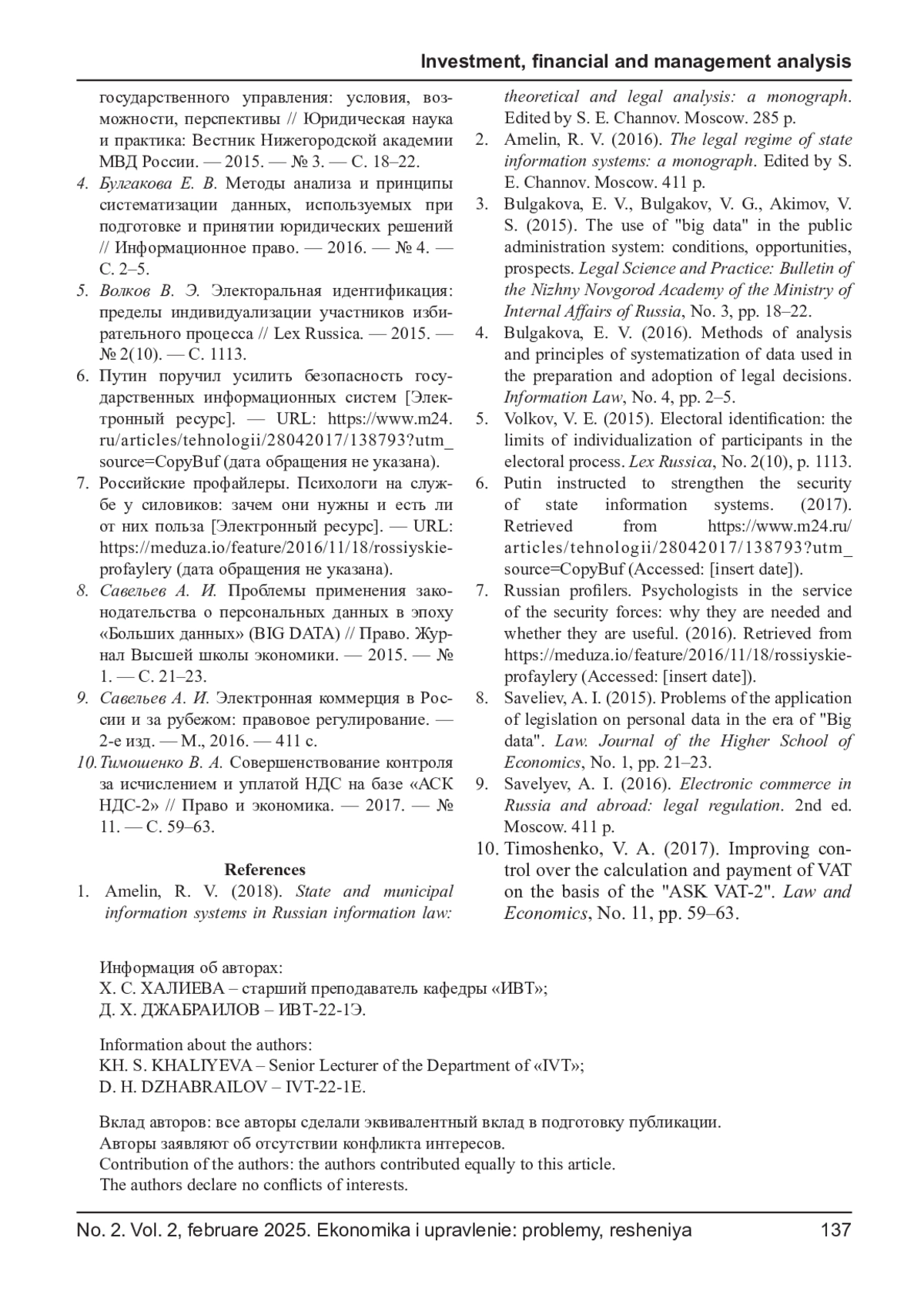 4. Булгакова Е. В. Методы анализа и принципы систематизации данных, используемых при подготовке и принятии юридических решений // Информационное право. - 2016. - № 4. - С. 2-5. EDN: XEHQZT