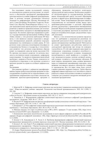 1. Морозов М. А. Цифровые компетенции персонала как инструмент повышения инновационности предприятия // Известия высших учебных заведений. Технология текстильной промышленности. 2022. № 2 (398). С. 292-298.