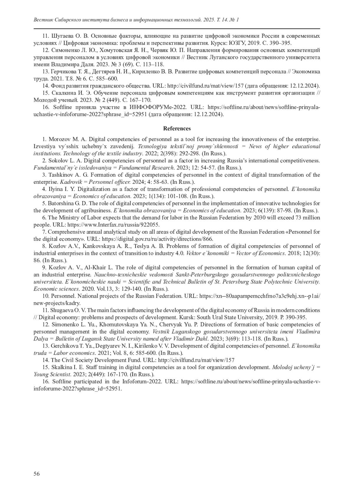 2. Соколов Л. А. Цифровые компетенции персонала как фактор повышения международной конкурентоспособности России // Фундаментальные исследования. 2023. № 12. С. 54-57.
