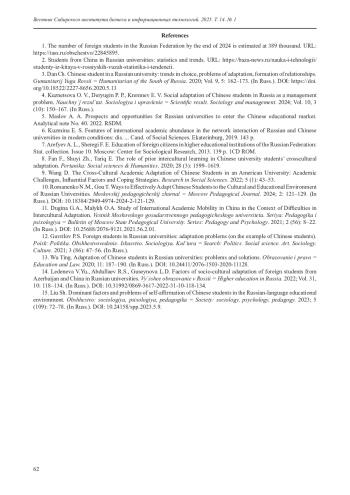 12. Гаврилов П. С. Иностранные студенты в российских вузах: проблемы адаптации (на примере китайских студентов) // Поиск: Политика. Обществоведение. Искусство. Социология. Культура. 2021. №3 (86). С. 47-56.