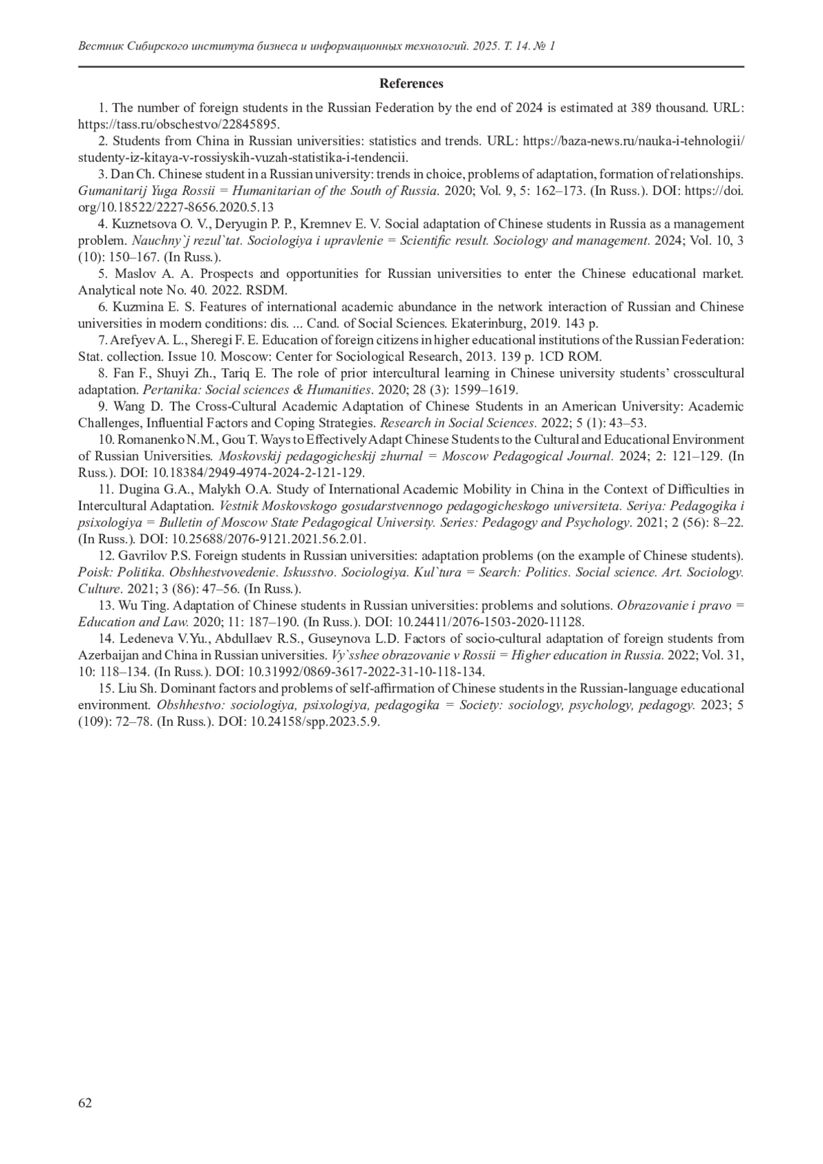 15. Лю Ш. Доминирующие факторы и проблемы самоутверждения китайских студентов в русскоязычной образовательной среде // Общество: социология, психология, педагогика. 2023. №5 (109). С. 72-78. https://doi.org/10.24158/spp.2023.5.9.