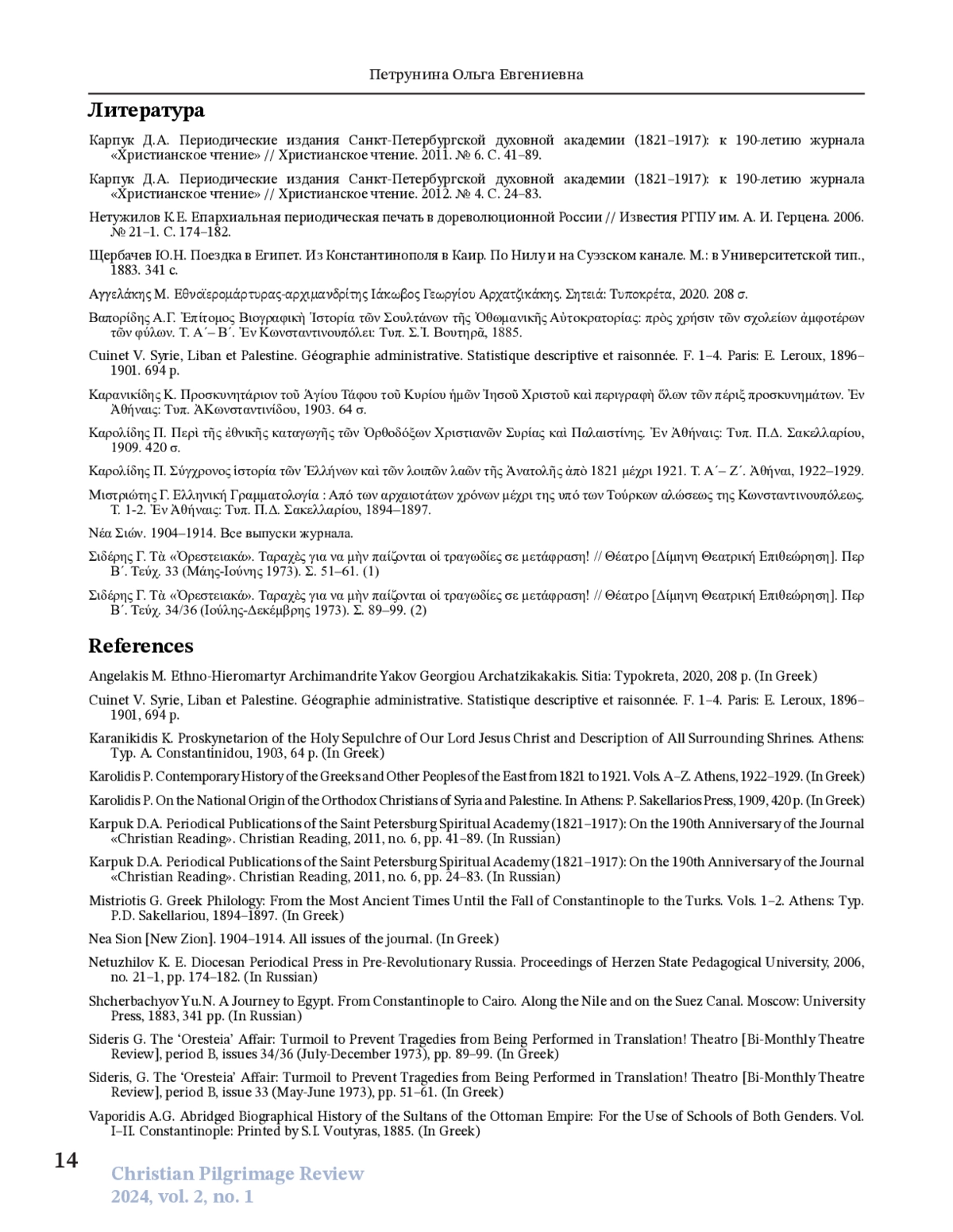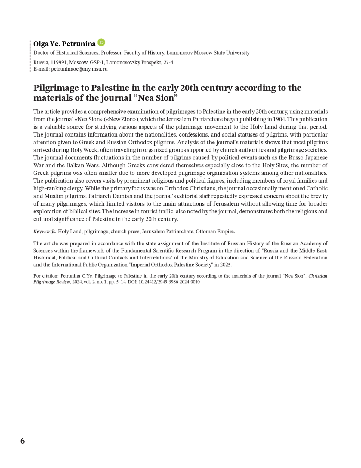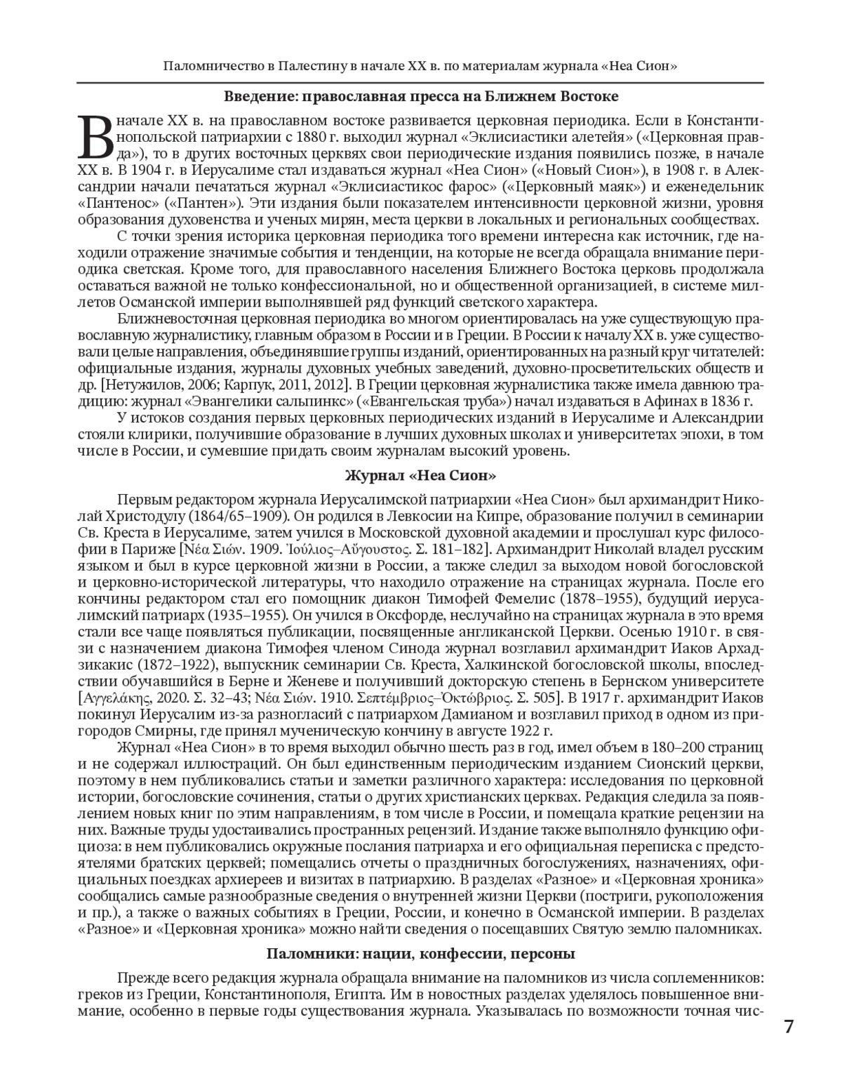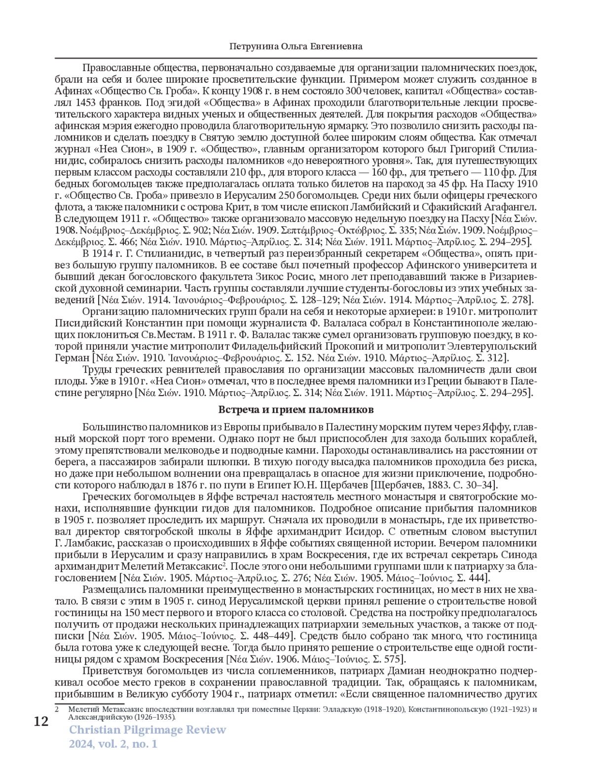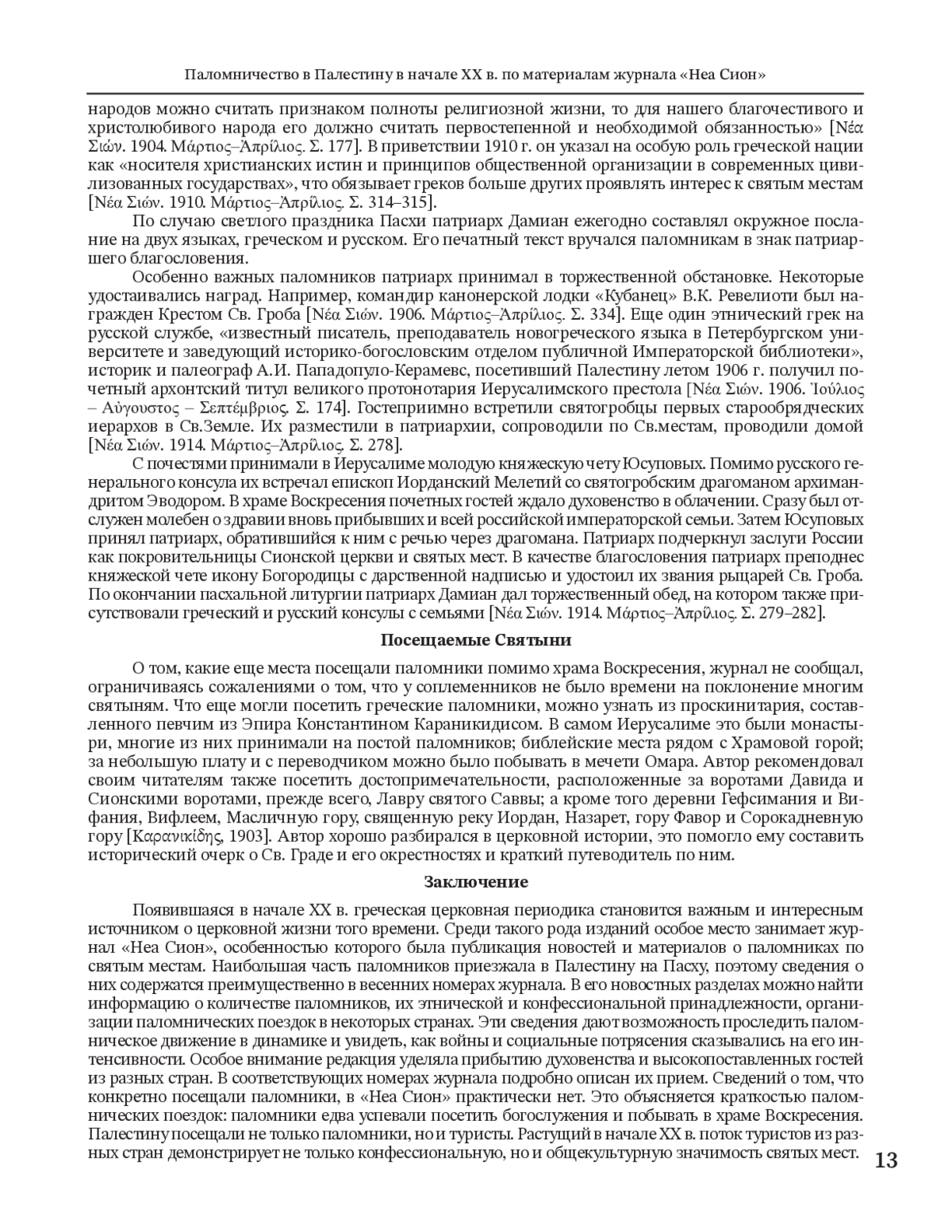В статье разносторонне исследуется паломничество в Палестину в начале XX в., по материалам журнала «Неа Сион» («Новый Сион»), который с 1904 г. начал издавать Иерусалимский патриархат. Это издание является ценным источником для изучения разных аспектов паломнического движения в Святую землю в указанный период. В журнале содержится информация о национальной принадлежности, вероисповедании и социальном статусе паломников, уделяется особое внимание греческим и русским православным богомольцам. Анализ материалов издания показывает, что большинство паломников прибывали на Страстной седмице, часто путешествуя организованными группами при поддержке церковных властей и паломнических обществ. Журнал фиксирует колебания числа паломников, вызванные политическими событиями, такими как русско-японская война и Балканские войны. Хотя греки считали себя особенно близкими к Святым местам, количество греческих паломников часто оказывалось меньше из-за более развитых систем организации паломничества у других национальностей. Издание также освещает визиты видных религиозных и политических деятелей, включая членов королевских семей и высшее духовенство. Хотя основное внимание уделялось православным христианам, журнал иногда упоминал католических и мусульманских паломников. Патриарх Дамиан и редакция журнала неоднократно выражали обеспокоенность по поводу краткости многих паломничеств, что ограничивало посетителей лишь главными достопримечательностями Иерусалима, не давая времени на более широкое исследование библейских мест. Рост потока туристов, также отмеченный журналом, демонстрирует как религиозную, так и культурную значимость Палестины в начале XX в.