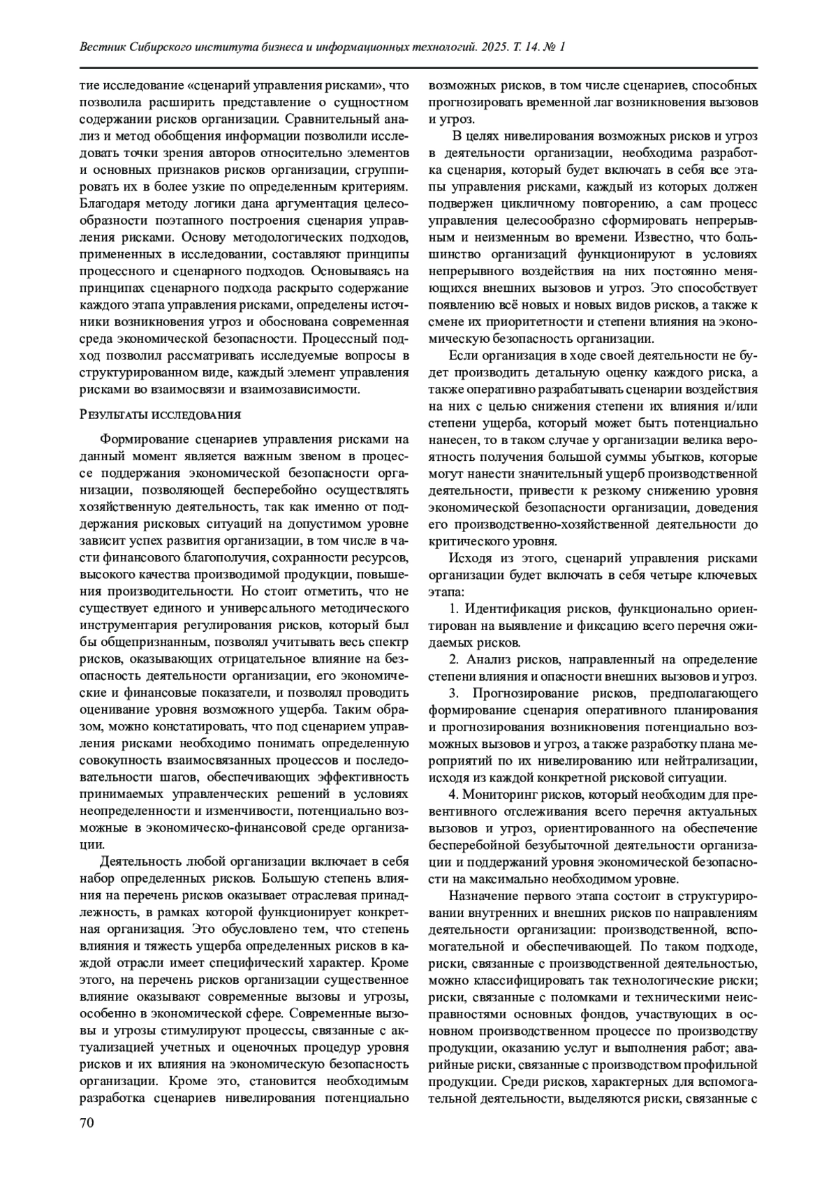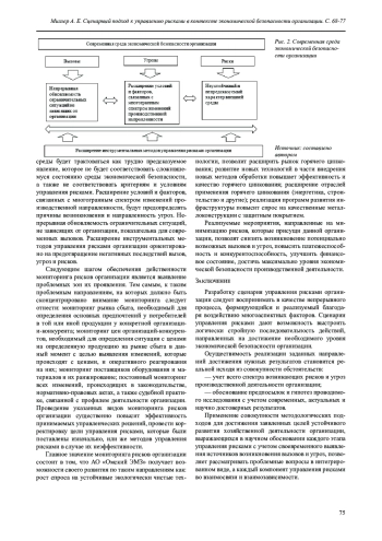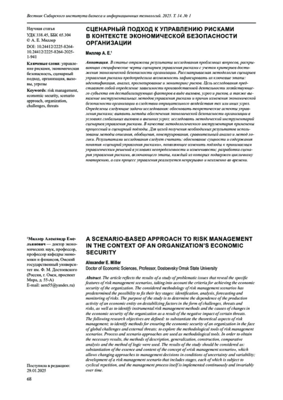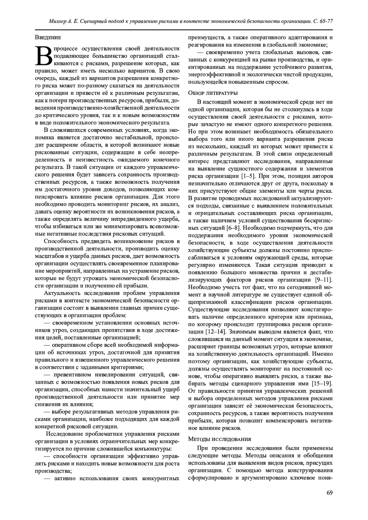В статье отражены результаты исследования проблемных вопросов, раскрывающих специфические черты сценариев управления рисками с учетом критериев достижения экономической безопасности организации. Рассматриваемая методология сценариев управления рисками предопределила возможность зафиксировать их ключевые этапы: идентификация, анализ, прогнозирование и мониторинг рисков. Цель исследования представляет собой определение зависимости производственной деятельности хозяйствующего субъекта от дестабилизирующих факторов в виде вызовов, угроз и рисков, а также выявление инструментальных методов управления рисками и причин изменения экономической безопасности организации в следствии отрицательного воздействия тех или иных угроз. Определены следующие задачи исследования: обосновать теоретические аспекты управления рисками; выявить методы обеспечения экономической безопасности организации в условиях глобальных вызовов и внешних угроз; исследовать методический инструментарий сценариев управления рисками. В качестве методологического инструментария применены процессный и сценарный подходы. Для целей получения необходимых результатов использованы методы описания, обобщения, конструирования, сравнительный анализ и метод логики. Результатами исследования следует считать: обоснование сущности и содержания понятия «сценарий управления рисками», позволяющее изменить подходы к принимаемым управленческим решений в условиях неопределенности и изменчивости; разработка сценария управления рисками, включающего этапы, каждый из которых подвержен цикличному повторению, а сам процесс управления реализуется непрерывно и неизменно во времени.