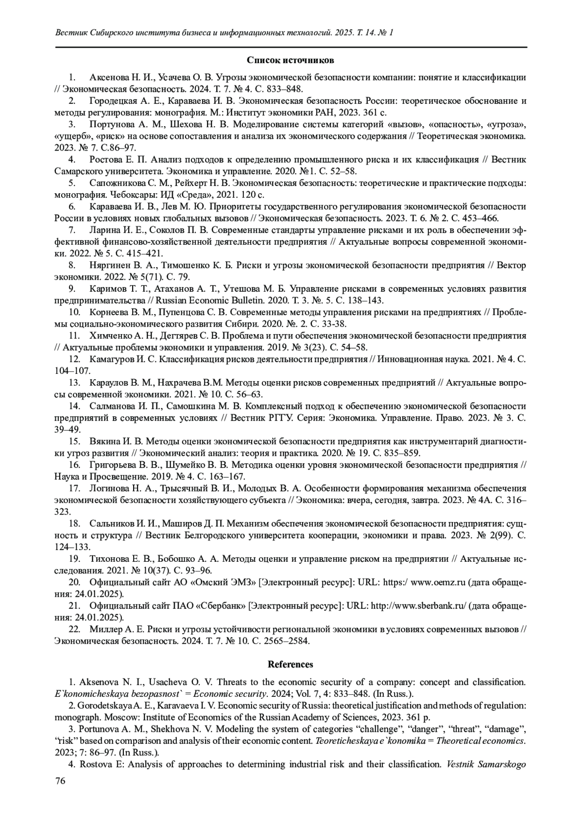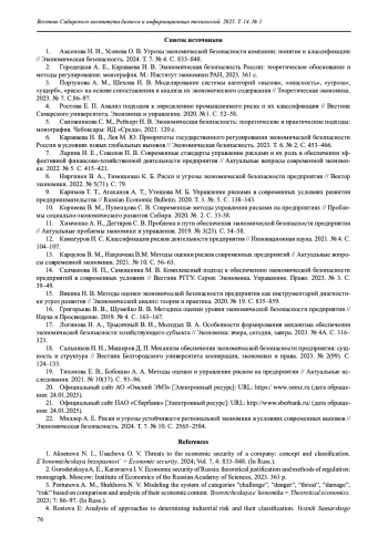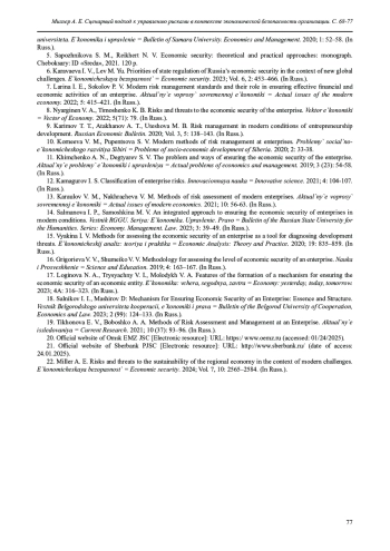 14. Салманова И. П., Самошкина М. В. Комплексный подход к обеспечению экономической безопасности предприятий в современных условиях // Вестник РГГУ. Серия: Экономика. Управление. Право. 2023. № 3. С. 39-49.
