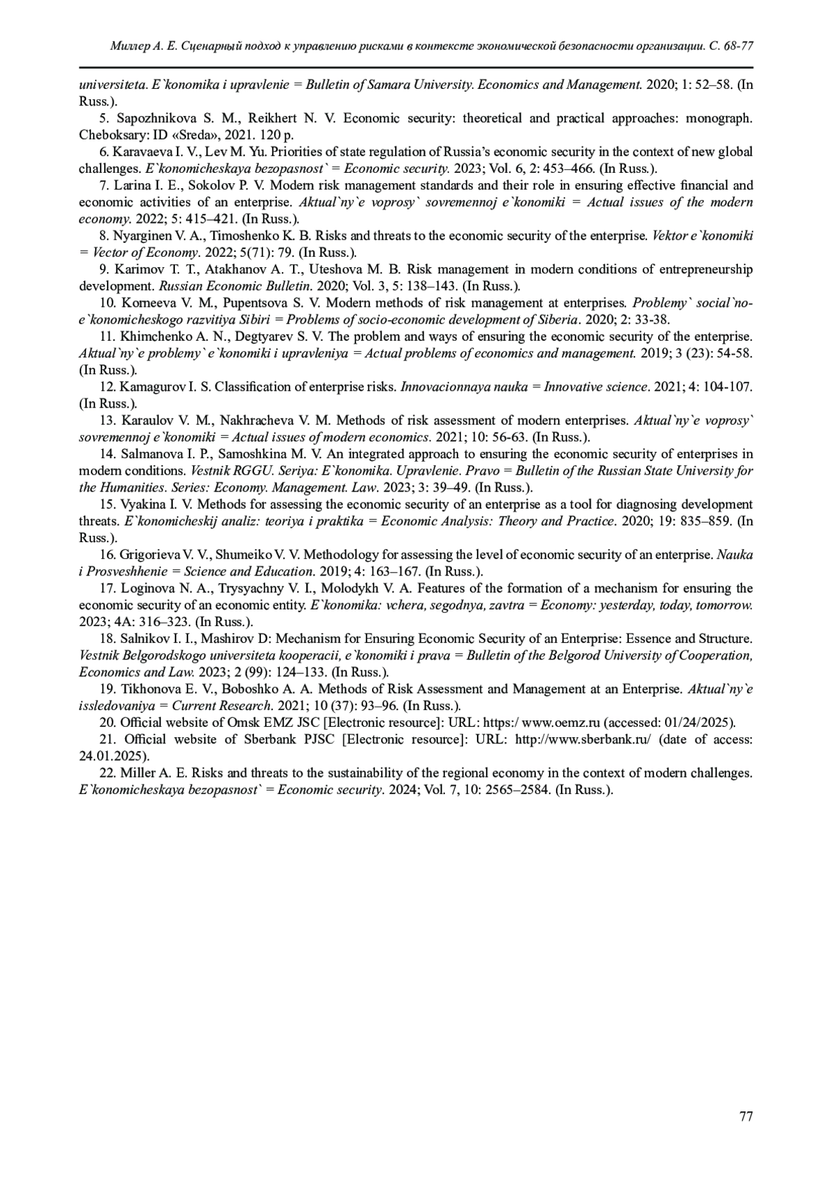 22. Миллер А. Е. Риски и угрозы устойчивости региональной экономики в условиях современных вызовов // Экономическая безопасность. 2024. Т. 7. № 10. С. 2565-2584.