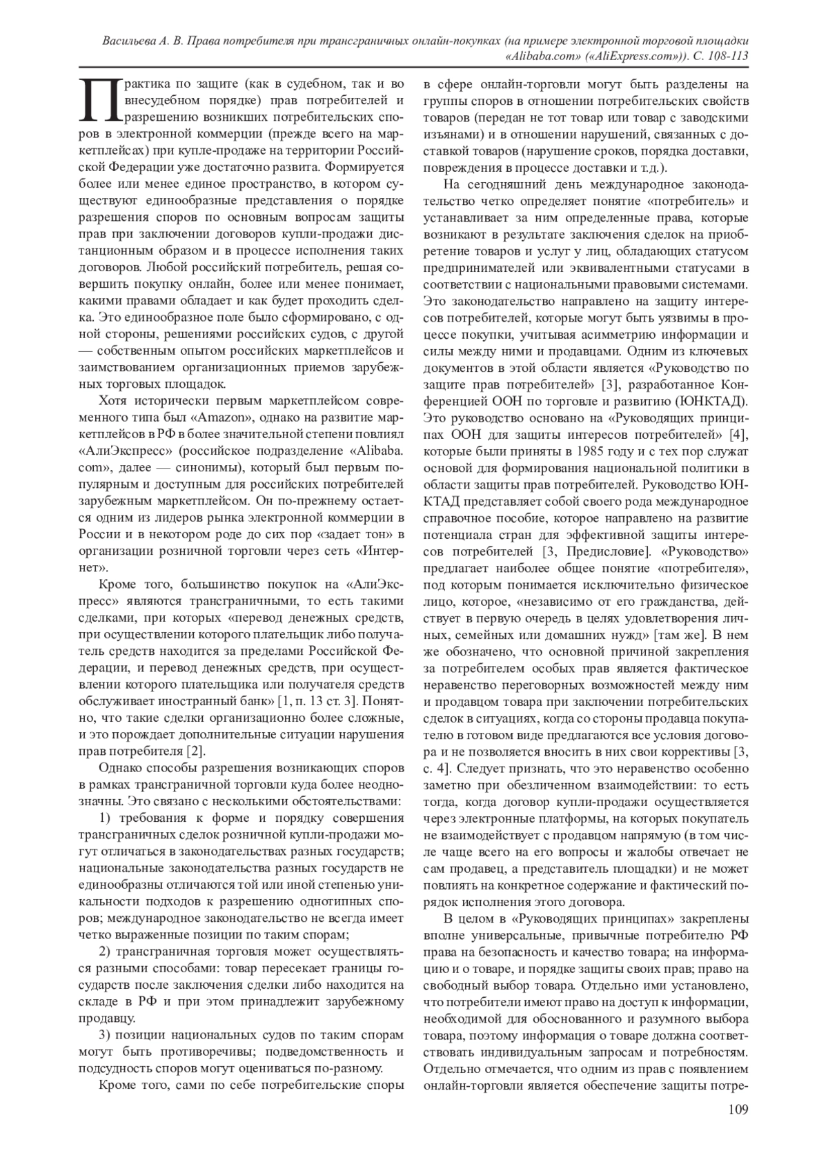 В статье рассмотрен вопрос реализации прав потребителей в рамках розничной торговли на международных электронных площадках на примере Alibaba. com (Aliexpress. com). Предметом изучения выступает современное состояние гражданского законодательства в области защиты прав потребителей на международных площадках (в том числе при совершении трансграничных покупок).