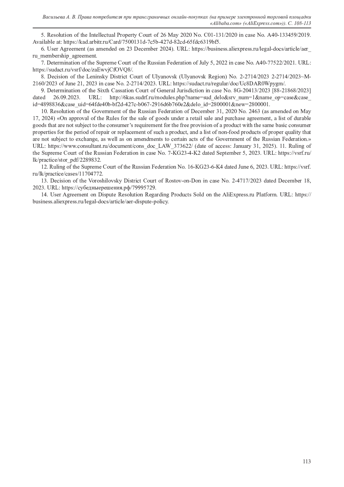 14. Пользовательское соглашение о разрешении споров в отношении товаров, реализуемых на платформе AliExpress.ru. URL: https://business.aliexpress.ru/legal-docs/article/aer-dispute-policy (дата обращения: 31.01.2025).