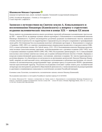 Целью данного исследования является анализ различных стратегий публикации паломнических текстов конца XIX — начала XX вв. на примере путевых записок протоирея А. Ковальницкого и воспоминаний епископа Никанора (Каменского). В работе анализируются различные редакции паломнических текстов, выявляется степень участия издательств в их корректировке и определяется роль авторов в сохранении и трансформации своих работ. Источниковая база исследования включает публикации протоирея А. Ковальницкого в журнале «Странник» (1885–1891), его заметки в провинциальных епархиальных ведомостях и отдельных книгах (1886– 1913), а также публичные чтения «По Святой земле» (1911–1912). Воспоминания епископа Никанора представлены восемью самостоятельными заметками, опубликованными как в духовных изданиях (1893–1902), так и в отдельных книжных изданиях ИППО (1898, 1902, 1906). Исследование демонстрирует, что А. Ковальницкий использовал свои путевые заметки как основу для создания публицистических текстов и чтений, обращаясь к вопросам взаимоотношений православных с католиками, униатами и иудеями. Его тексты переиздавались в различных формах, что обеспечивало их актуальность на протяжении десятилетий. Епископ Никанор (Каменский), опираясь на свой высокий статус, интегрировал воспоминания в публичные выступления, что способствовало их систематическому распространению через духовную прессу и издательство ИППО, придававшее текстам идеологический характер. Результаты исследования позволяют глубже понять роль паломнической литературы как инструмента духовной и общественной деятельности, а также механизмов её распространения и адаптации в изменяющихся социальных и политических условиях Российской империи.