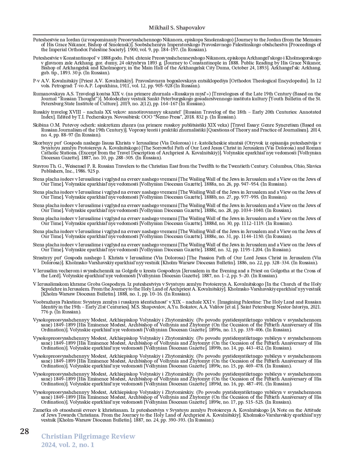 49. Kovalnitskiy A. Iz puteshestviya v Svyatuyu Zemlyu [From a Journey to the Holy Land]. Strannik [The Pilgrim]. 1890b, no. 9, pp. 118-133. (In Russian).