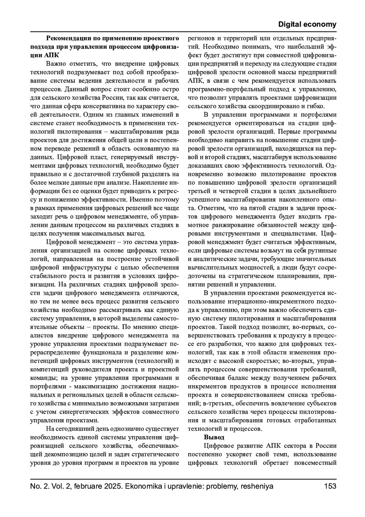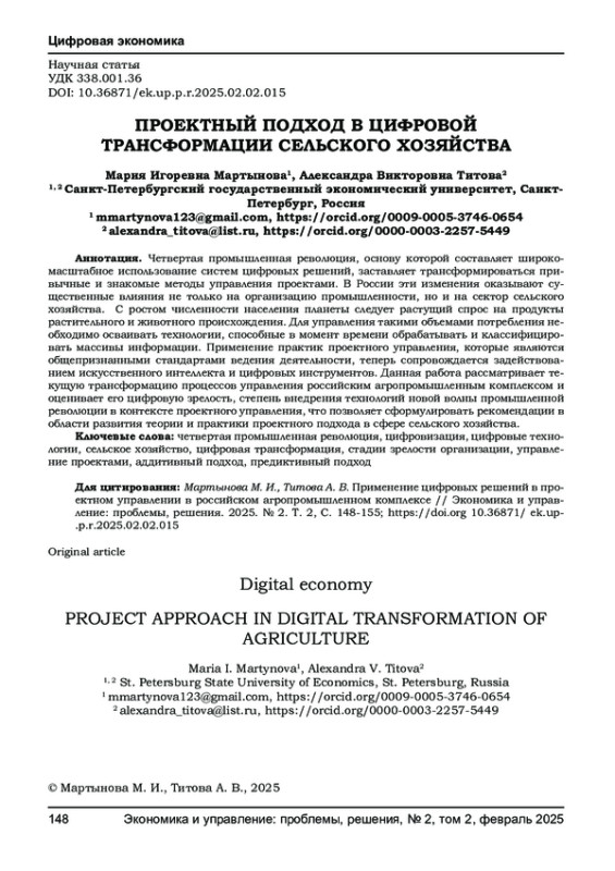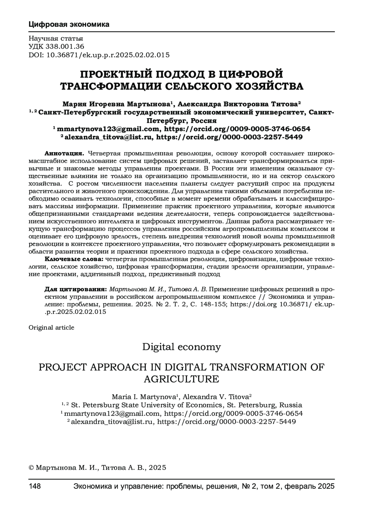 МАРТЫНОВА М. И., ТИТОВА А. В. ПРОЕКТНЫЙ ПОДХОД В ЦИФРОВОЙ ТРАНСФОРМАЦИИ СЕЛЬСКОГО ХОЗЯЙСТВА // ЭКОНОМИКА И УПРАВЛЕНИЕ: ПРОБЛЕМЫ, РЕШЕНИЯ. 2025. ТОМ 2 № 2