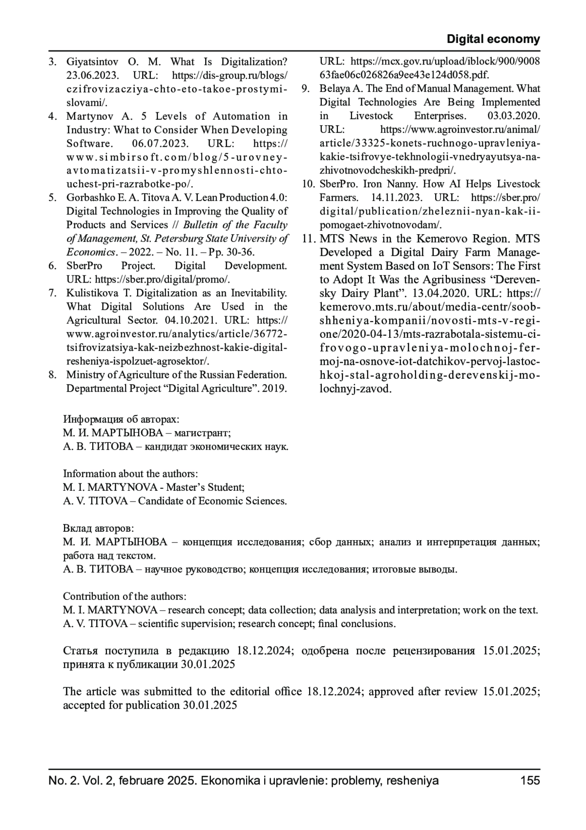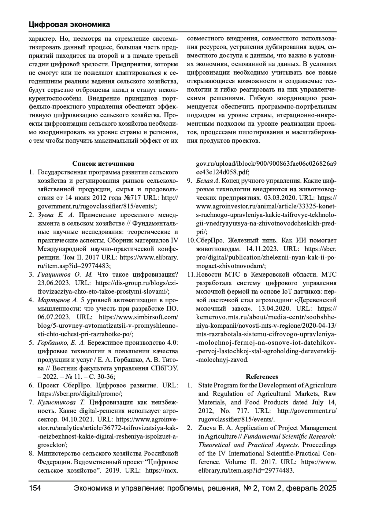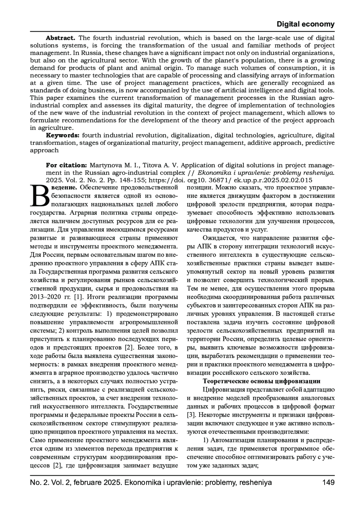 МАРТЫНОВА М. И., ТИТОВА А. В. ПРОЕКТНЫЙ ПОДХОД В ЦИФРОВОЙ ТРАНСФОРМАЦИИ СЕЛЬСКОГО ХОЗЯЙСТВА // ЭКОНОМИКА И УПРАВЛЕНИЕ: ПРОБЛЕМЫ, РЕШЕНИЯ. 2025. ТОМ 2 № 2