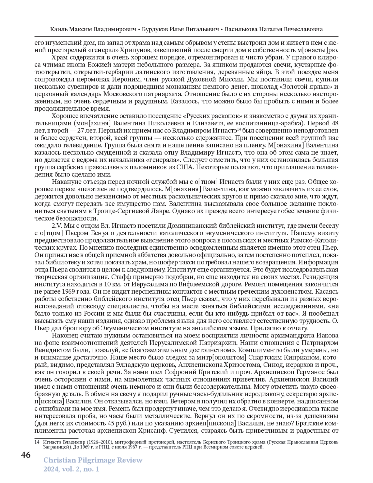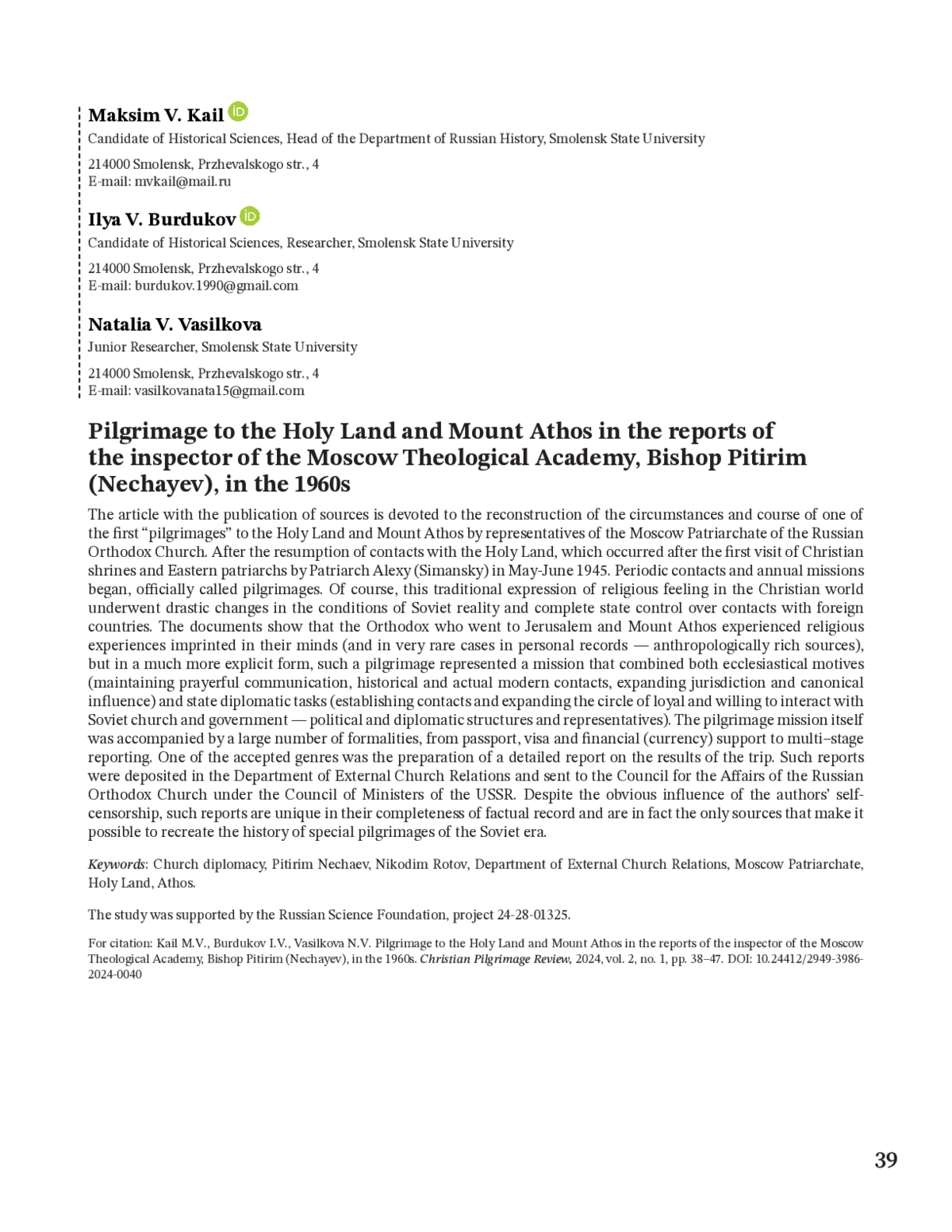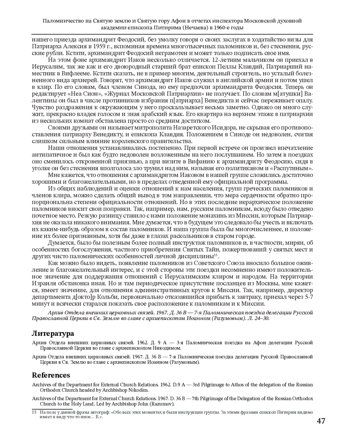 Статья с публикацией источников посвящена реконструкции обстоятельств и хода одного из первых «паломничеств» в Святую землю и на Афон представителей Московского патриархата Русской православной церкви. После возобновления контактов со Святой землей, произошедшего после первого посещения христианских святынь и восточных патриархов патриархом Алексием (Симанским) в мае-июне 1945 г. начались периодические контакты и ежегодные миссии, носившие официальное именование паломничества. Разумеется, это традиционное в христианском мире выражение религиозного чувства в условиях советской действительности и полного государственного контроля за контактами с заграницей претерпевало решительные изменения. Документы свидетельствуют, что отправлявшиеся в Иерусалим и на Афон православные переживали религиозный опыт, запечатленный в их сознании (и в очень редких случаях в личных записях — антропологически насыщенных источниках), но в гораздо более явленной форме такое паломничество представляло миссию, в которой сочетались как церковные мотивы (поддержание молитвенного общения, исторических и действительных современных контактов, расширение юрисдикции и канонического влияния), так и государственные дипломатические задачи (установление контактов и расширение круга лояльных и готовых ко взаимодействую с советскими церковными и государственными — политико-дипломатическими структурами и представителями). Само паломничество — миссия сопровождалось большим количеством формальностей, от паспортно-визового и финансового (валютного) обеспечения до многоступенчатой отчетности. Одним из принятых жанров была подготовка обстоятельного отчета по итогам поездки. Такие отчеты откладывались на хранение в Отделе внешних церковных сношений, направлялись в Совет по делам Русской православной церкви при Совете министров СССР. Несмотря на очевидное влияние самоцензуры авторов такие отчеты являются уникальными по полноте фактологической фиксации и фактически единственными источниками, позволяющими воссоздать историю особых паломничеств советской эпохи.