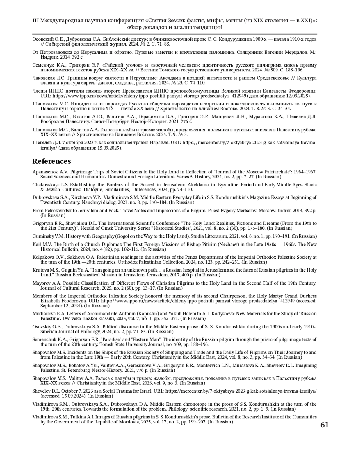 Целью статьи является обзор докладов, выводов и вопросов III Международной научной конференции «Святая Земля: факты, мифы, мечты (из ХІХ столетия — в ХХІ)», состоявшейся на базе Тюменского государственного университета 14 ноября 2024 г. и организованной в рамках научного проекта № 24-28-01063 «Провинциальное паломничество на Святую Землю: база данных, исследование, библиографический указатель», финансируемого Российским научным фондом. Данная конференция, ставшая третьей по счету в 2024 г., продолжила традицию междисциплинарного изучения Святой земли. С 2020 г., выступая в качестве научной площадки, аккумулировала ключевые направления современных исследований о Святой земле в разных аспектах. Святая земля как хронотоп в литературе и документах, как пространство деятельности Русской духовной миссии и ИППО, как объект иеротопии и как территория современных израильско-палестинских отношений. В рамках конференции выступили более двадцати участников из России, Беларуси и США. Были представлены исследования в области истории, филологии, культурологии, политологии, иеротопии, иудаики и израилеведения, которые взаимодополняли друг друга, способствовали комплексному осмыслению темы Святой земли в религиозной, культурной и исторической перспективах и расширили методологические горизонты изучения. Наиболее масштабной стала дискуссионная панель «Святая Земля в русской литературе и паломнических текстах», в докладах которой подчеркивалась важность культурно-исторического подхода. Панель «Иерусалим в истории и культуре: образы, символы и художественные интерпретации», в отличие от первой, сосредоточенной на русских паломниках и источниках, делала акцент на международных, кросскультурных и исторических трансформациях Иерусалима. Она объединила доклады по теме истории символа в мировой культуре с использованием различных научных подходов. Также были представлены две дискуссионные площадки об истории и личностях Русской духовной миссии в период с XIX по XX вв. В заключение конференции был проведен круглый стол «Паломнические практики рубежа веков: экономика, транспорт и повседневность», на котором участниками были актуализированы такие вопросы, как портретирование паломника; сохранность документов в регионах; тенденции изменения паломничества, связанные с развитием социокультурных и экономических условий; роль транспорта в изменении традиционных представлений о паломничестве. Конференция подтвердила устойчивую тенденцию к углублению междисциплинарного диалога и расширению нарративного спектра в изучении Святой земли.
