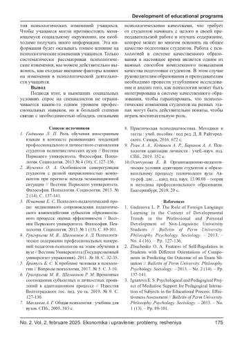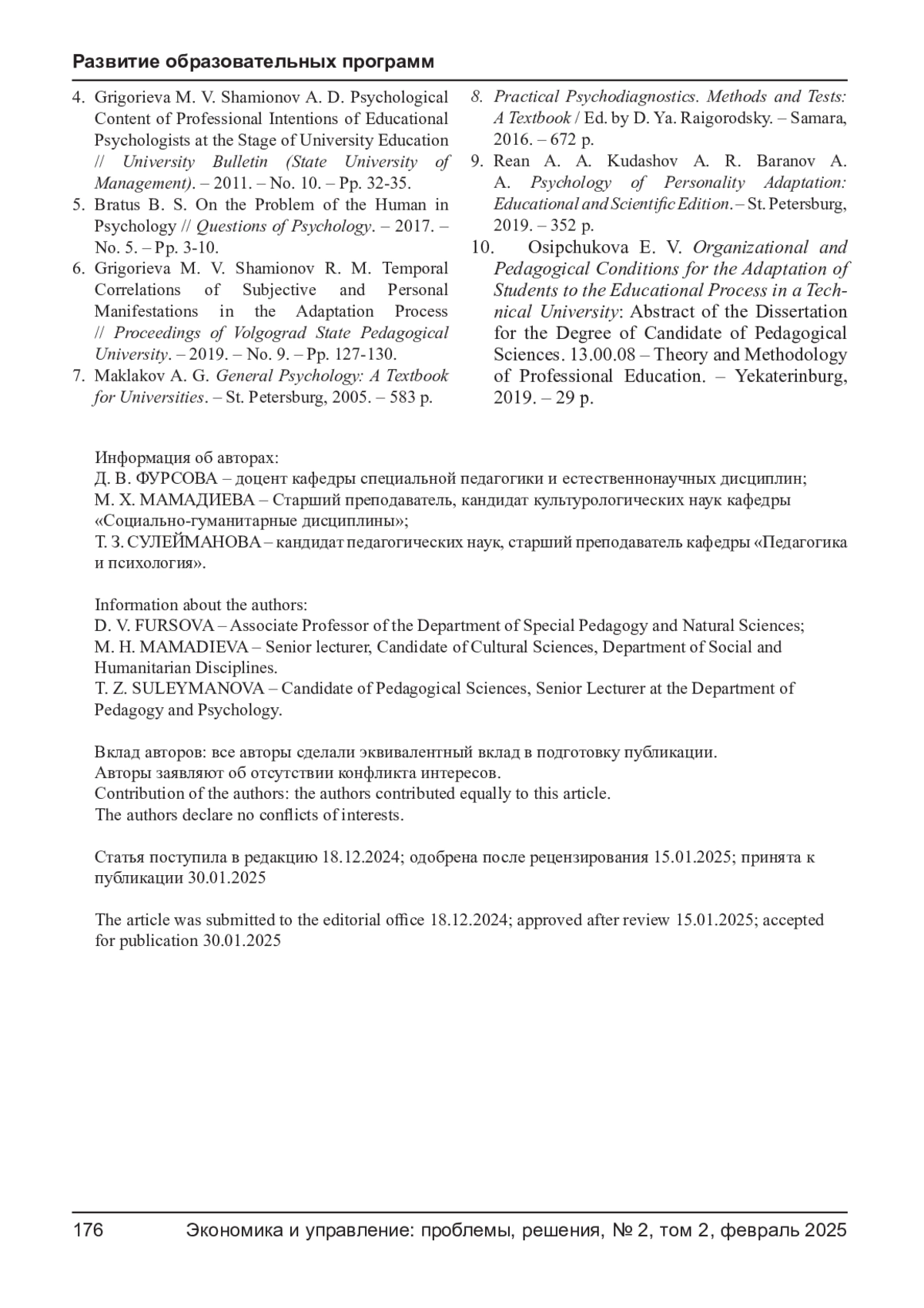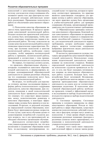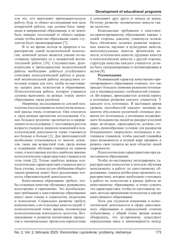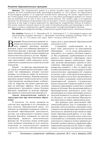 ФУРСОВА Д. В., МАМАДИЕВА М. Х., СУЛЕЙМАНОВА Т. З. ПСИХОЛОГИЧЕСКИЕ АСПЕКТЫ И ХАРАКТЕРИСТИКИ ПРИ КАЧЕСТВЕННОМ ОБРАЗОВАНИИ // ЭКОНОМИКА И УПРАВЛЕНИЕ: ПРОБЛЕМЫ, РЕШЕНИЯ. 2025. ТОМ 2 № 2