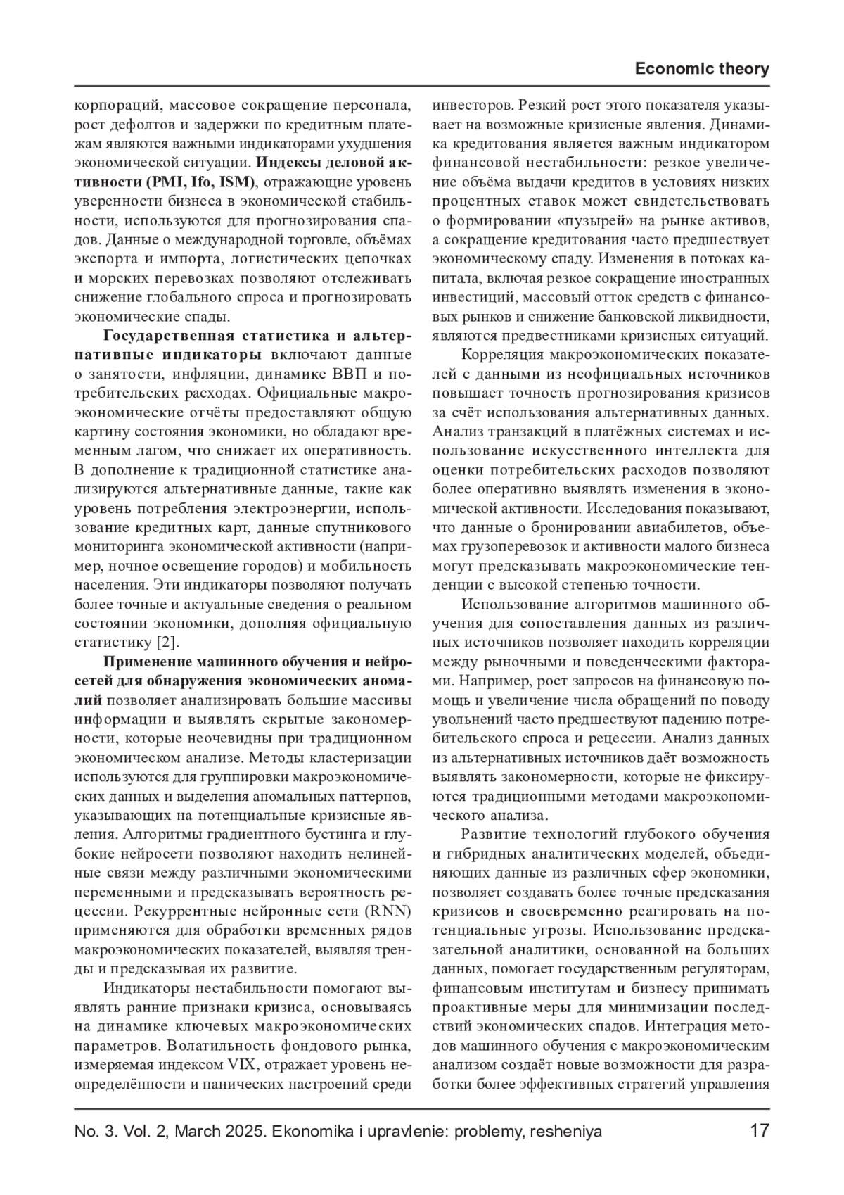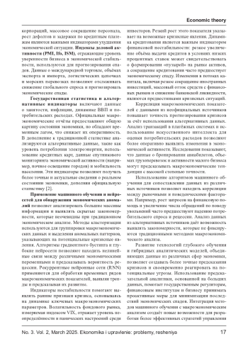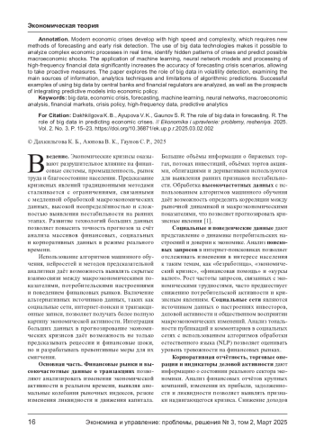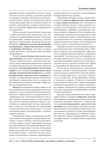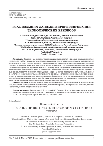 Современные экономические кризисы развиваются с высокой скоростью и сложностью, что требует новых методов прогнозирования и раннего выявления рисков. Использование технологий больших данных позволяет анализировать сложные экономические процессы в режиме реального времени, выявлять скрытые паттерны кризисов и предсказывать возможные макроэкономические потрясения. Применение машинного обучения, нейросетевых моделей и обработки высокочастотных финансовых данных значительно повышает точность прогнозирования кризисных сценариев, позволяя принимать упреждающие меры. В статье исследуется роль больших данных в выявлении нестабильности, рассматриваются основные источники информации, методы аналитики и ограничения алгоритмических предсказаний. Анализируются успешные примеры использования больших данных центральными банками и финансовыми регуляторами, а также перспективы интеграции предсказательных моделей в экономическую политику.