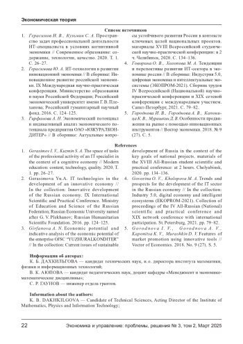 4. Говорина О. В., Холопова М. А. Тенденции и перспективы развития ИТ-сектора в экономике россии // В сборнике: Индустрия 5.0, цифровая экономика и интеллектуальные экосистемы (ЭКОПРОМ-2021). Сборник трудов IV Всероссийской (Национальной) научно-практической конференции и XIX сетевой конференции с международным участием. Санкт-Петербург, 2021. С. 79-82. EDN: QZDKXR