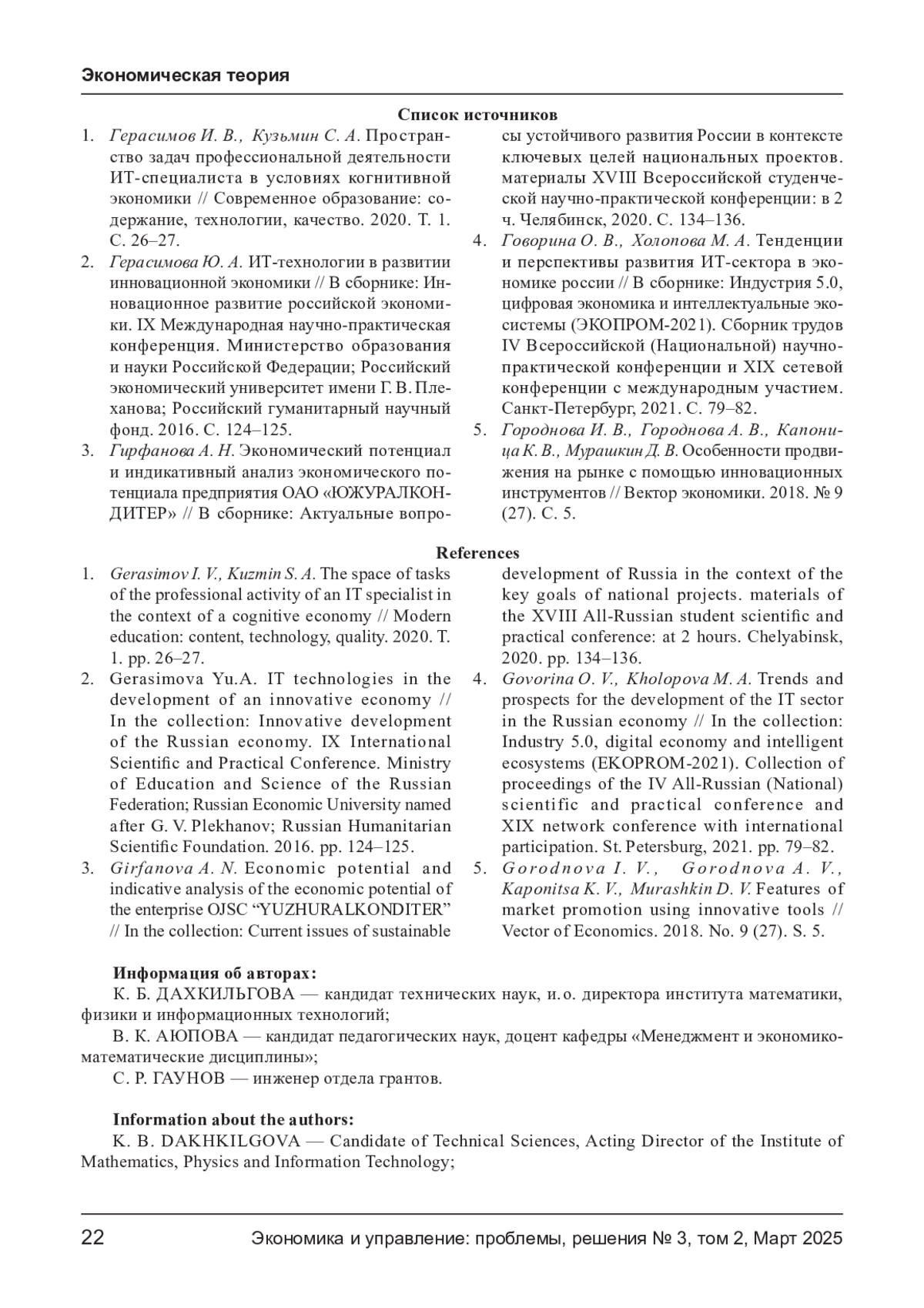 1. Герасимов И. В., Кузьмин С. А. Пространство задач профессиональной деятельности ИТ-специалиста в условиях когнитивной экономики // Современное образование: содержание, технологии, качество. 2020. Т. 1.С. 26-27. EDN: GGOOFS