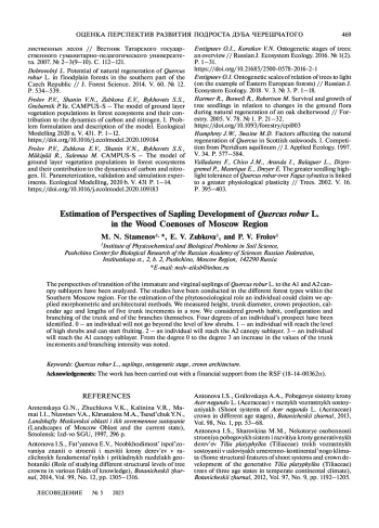 18. Стаменов М.Н. Поливариантность габитуса виргинильных и молодых генеративных особей Quercus robur L. (Fagaceae) в фитоценозах бассейна Верхней и Средней Оки // Фиторазнообразие Восточной Европы. 2020. Т. XIV. № 1. С. 66–90. DOI: 10.24411/2072-8816-2020-10066 EDN: MFXSFC