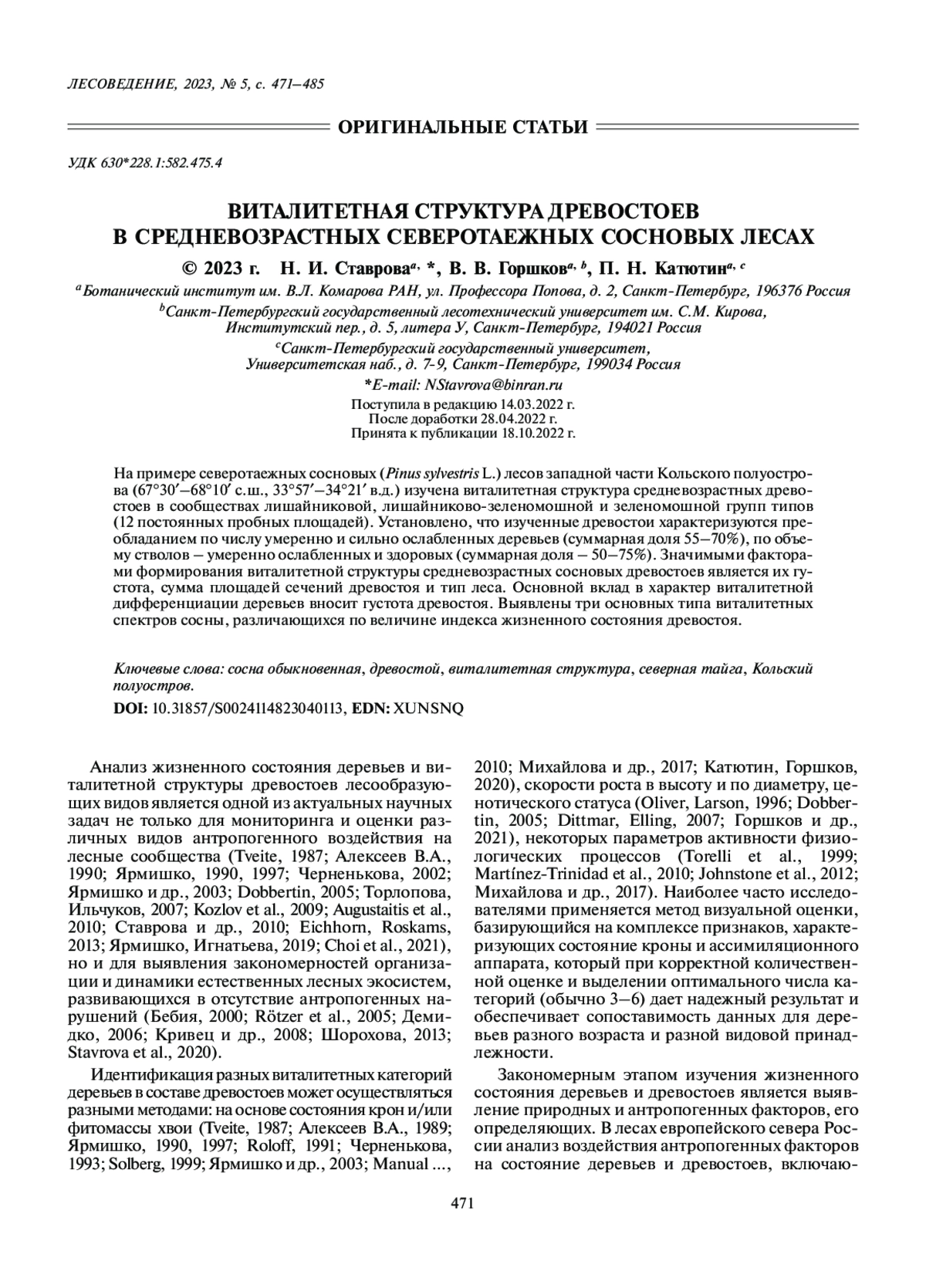 40. Ярмишко В.Т., Горшков В.В., Ставрова Н.И., Катютин П.Н. Многолетняя динамика виталитетной структуры древесного яруса хвойных лесов при разном уровне промышленного загрязнения на Кольском полуострове // Проблемы экологии растительных сообществ. СПб.: ВВМ, 2005. С. 58–70.