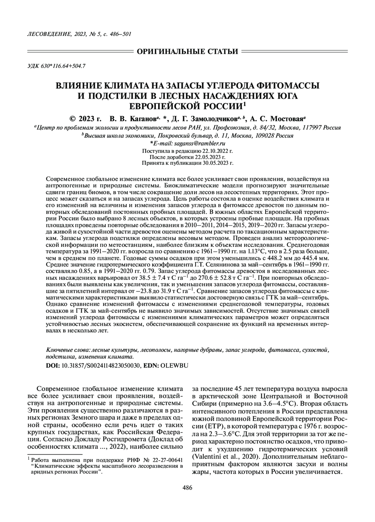 Современное глобальное изменение климата все более усиливает свои проявления, воздействуя на антропогенные и природные системы. Биоклиматические модели прогнозируют значительные сдвиги границ биомов, в том числе сокращение доли лесов на лесостепных территориях. Этот процесс может сказаться и на запасах углерода. Цель работы состояла в оценке воздействия климата и его изменений на величины и изменения запасов углерода в фитомассе древостоя по данным повторных обследований постоянных пробных площадей. В южных областях Европейской территории России было выбрано 8 лесных объектов, в которых устроены пробные площади. На пробных площадях проведены повторные обследования в 2010–2011, 2014–2015, 2019–2020 гг. Запасы углерода живой и сухостойной части древостоя оценены методом расчета по таксационным характеристикам. Запасы углерода подстилки определены весовым методом. Проведен анализ метеорологической информации по метеостанциям, наиболее близким к объектам исследования. Среднегодовая температура за 1991–2020 гг. возросла по сравнению с 1961–1990 гг. на 1.13°С, что в 2.5 раза больше, чем в среднем по планете. Годовые суммы осадков при этом уменьшились с 448.2 мм до 445.4 мм. Среднее значение гидротермического коэффициента Г. Т. Селянинова за май–сентябрь в 1961–1990 гг. составляло 0.85, а в 1991–2020 гг. 0.79. Запас углерода фитомассы древостоя в исследованных лесных насаждениях варьировал от 38.5 ± 7.4 т С га–1 до 270.6 ± 52.8 т С га–1. При повторных обследованиях были выявлены как увеличения, так и уменьшения запасов углерода фитомассы, составлявшие за пятилетний интервал от –23.8 до 31.9 т С га –1. Сравнение запасов углерода фитомассы с климатическими характеристиками выявило статистически достоверную связь с ГТК за май–сентябрь. Однако сравнение изменений фитомассы с изменениями среднегодовой температуры, годовых осадков и ГТК за май-сентябрь не выявило значимых зависимостей. Отсутствие значимых связей изменений углерода фитомассы с изменениями климатических параметров может определяться устойчивостью лесных экосистем, обеспечивающей сохранение их функций на временных интервалах в несколько лет