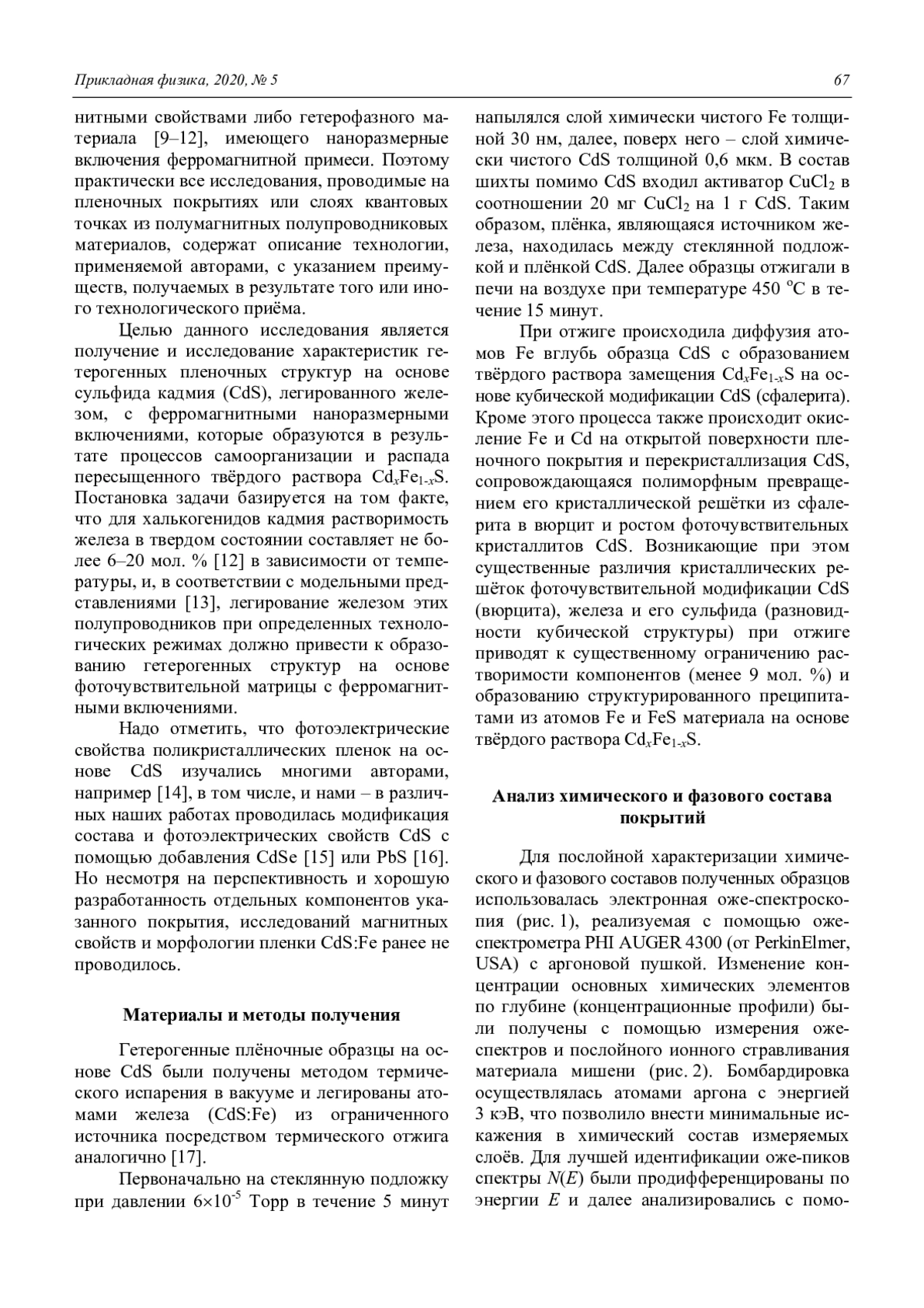 Методами магнитно-силовой микроскопии (МСМ) и электронной оже-спектроскопии (ЭОС) исследованы плёночные образцы полумагнитного полупроводника на основе CdS, полученные термическим испарением и легированные Fe из поверхностного наноразмерного источника посредством отжига. Свойства слоев CdS: Fe определяются наличием отдельных атомов Fe, растворенных в CdS, и расположением наноразмерных фаз с ферромагнитными свойствами. Совместный анализ результатов МСМ, ЭОС и температурной зависимости магнитной восприимчивости позволил идентифицировать два типа наноразмерных магнитных фаз – FeS и Fe2O3, расположенных в пленке твердого раствора CdхFe1-xS.