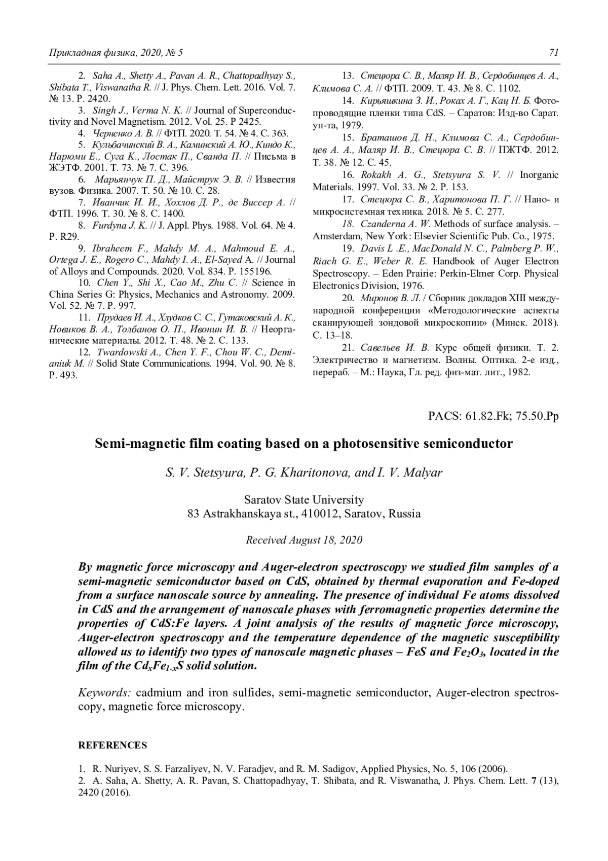 13. Стецюра С. В., Маляр И. В., Сердобинцев А. А., Климова С. А. // ФТП. 2009. Т. 43. № 8. С. 1102.