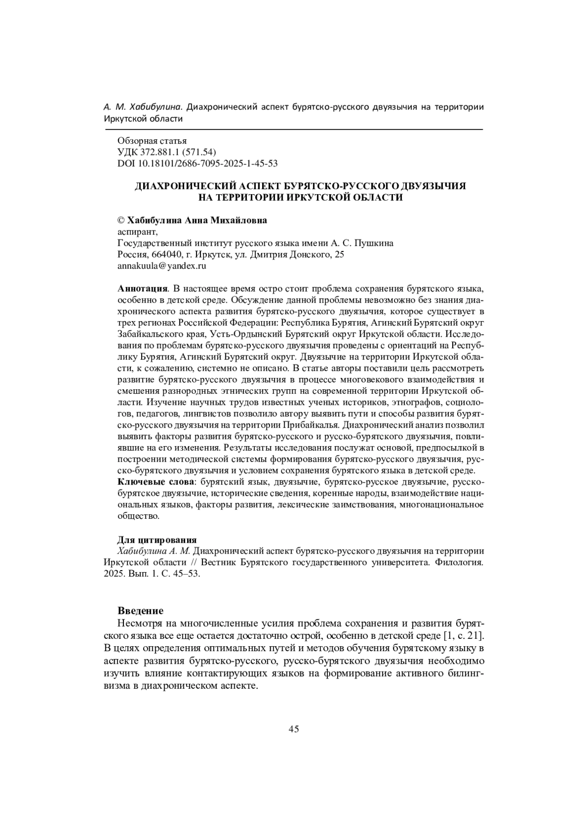 Несмотря на многочисленные усилия проблема сохранения и развития бурятского языка все еще остается достаточно острой, особенно в детской среде [1, с. 21]. В целях определения оптимальных путей и методов обучения бурятскому языку в аспекте развития бурятско-русского, русско-бурятского двуязычия необходимо изучить влияние контактирующих языков на формирование активного билингвизма в диахроническом аспекте.