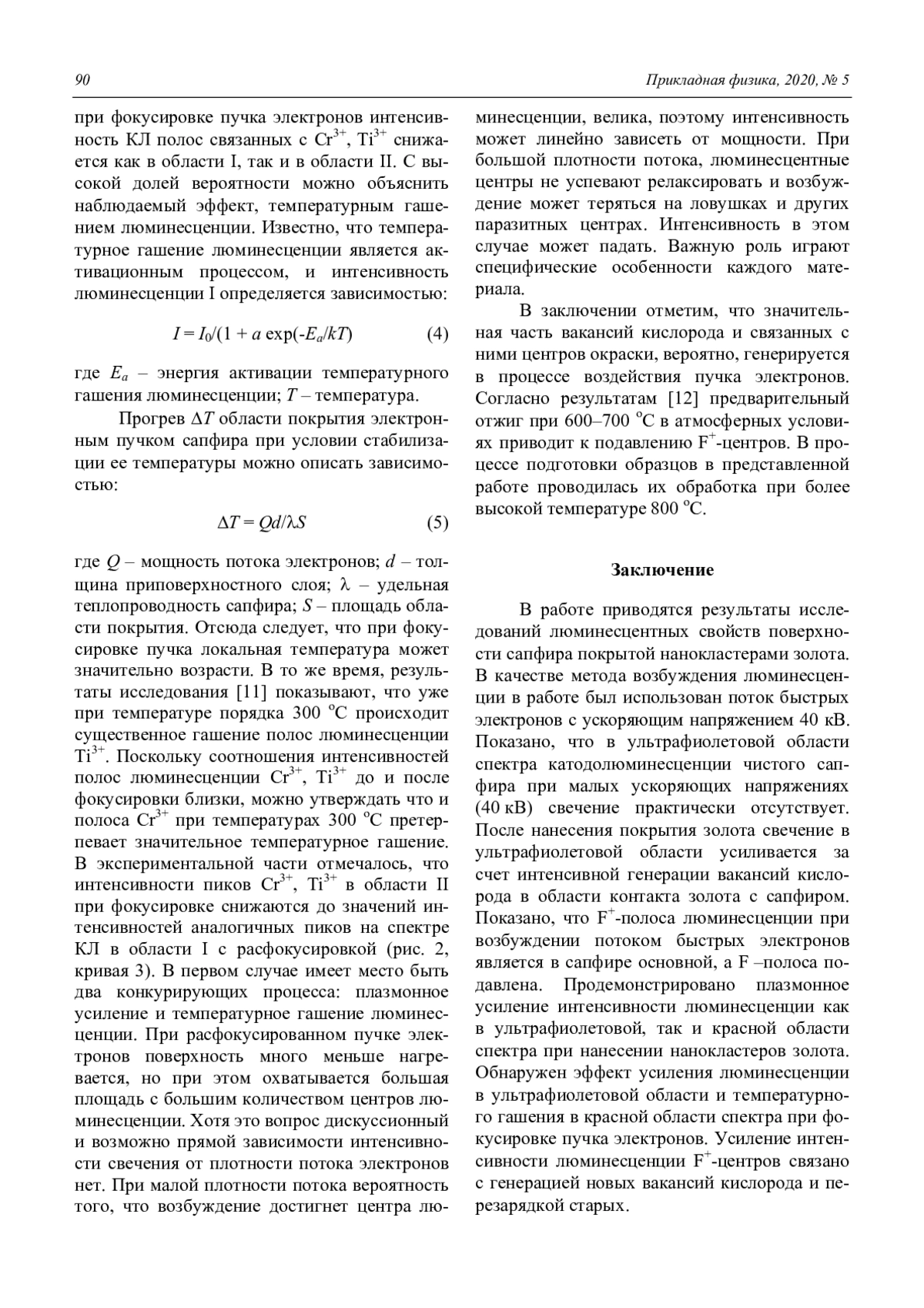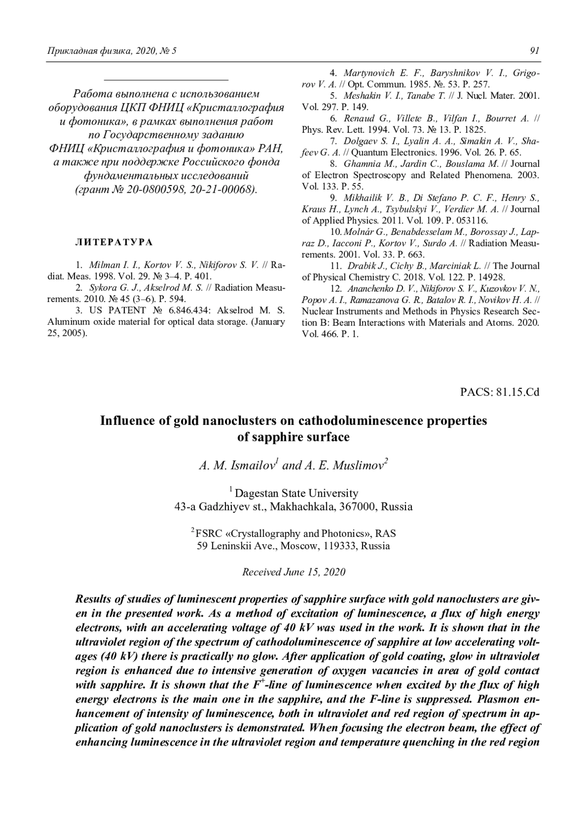 ИСМАИЛОВ А. (., МУСЛИМОВ А. Э. ВЛИЯНИЕ НАНОКЛАСТЕРОВ ЗОЛОТА НА КАТОДОЛЮМИНЕСЦЕНЦИЮ ПОВЕРХНОСТИ САПФИРА // ПРИКЛАДНАЯ ФИЗИКА. 2020. № 5