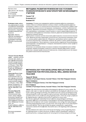 В статье рассматривается проблема развития рефлексии начинающего учителя. Целью исследования является изучение условий и способов развития рефлексии начинающего учителя и его психологического благополучия. К используемым в работе методам относятся психологическое тестирование, анкетирование, методы статистической обработки. Приводятся результаты эмпирического исследования, которые свидетельствуют о преобладании у начинающих учителей среднего и низкого уровней рефлексивности. В соотношении видов рефлексии начинающих учителей, рефлексия настоящей деятельности выражена в меньшей степени.