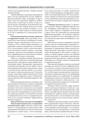 Развитие аддитивных технологий (3D-печати) оказывает влияние на промышленное производство, создавая новые возможности для снижения затрат, оптимизации процессов и повышения эффективности. Внедрение 3D-печати позволяет сократить расходы на материалы, логистику и доставку продукции, а также сократить сроки производства. В отличие от традиционных методов, аддитивное производство дает возможность создания сложных геометрических форм с потрясающими отходами, что повышает экологическую устойчивость производства. В статье рассматривается влияние преимуществ аддитивных технологий, их влияние на цепочки поставок, а также особенности применения в авиационно- космической, автомобильной, медицинской и строительной отраслях. Анализируются затраты на производство, сравниваются традиционные и цифровые методы производства, выявляются стандарты и ограничения массового развития 3D-печати в промышленности.