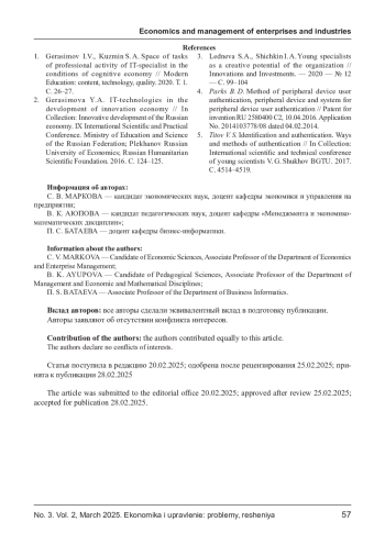 1. Герасимов И.В., Кузьмин С.А. Пространство задач профессиональной деятельности ИТ-специалиста в условиях когнитивной экономики //Современное образование: содержание, технологии, качество. 2020. Т. 1. С. 26-27. EDN: GGOOFS