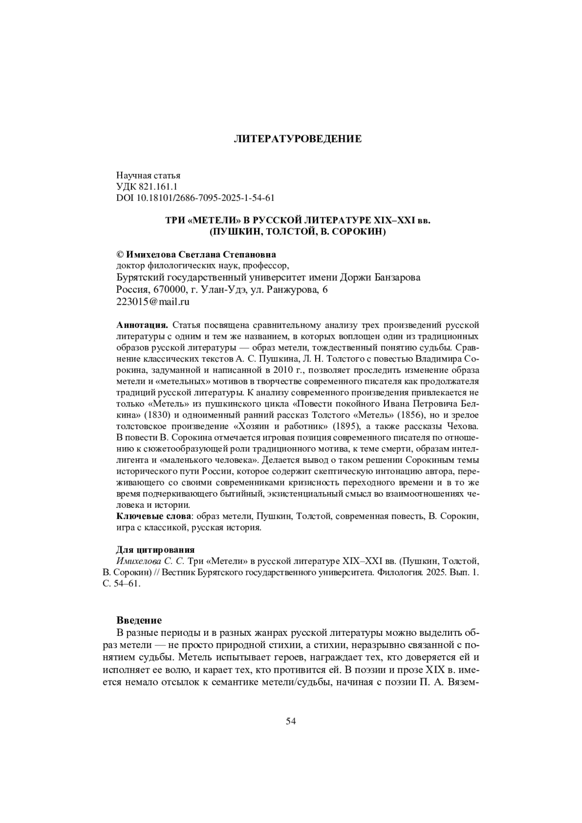 Статья посвящена сравнительному анализу трех произведений русской литературы с одним и тем же названием, в которых воплощен один из традиционных образов русской литературы - образ метели, тождественный понятию судьбы. Сравнение классических текстов А. С. Пушкина, Л. Н. Толстого с повестью Владимира Сорокина, задуманной и написанной в 2010 г., позволяет проследить изменение образа метели и «метельных» мотивов в творчестве современного писателя как продолжателя традиций русской литературы. К анализу современного произведения привлекается не только «Метель» из пушкинского цикла «Повести покойного Ивана Петровича Белкина» (1830) и одноименный ранний рассказ Толстого «Метель» (1856), но и зрелое толстовское произведение «Хозяин и работник» (1895), а также рассказы Чехова. В повести В. Сорокина отмечается игровая позиция современного писателя по отношению к сюжетообразующей роли традиционного мотива, к теме смерти, образам интеллигента и «маленького человека». Делается вывод о таком решении Сорокиным темы исторического пути России, которое содержит скептическую интонацию автора, переживающего со своими современниками кризисность переходного времени и в то же время подчеркивающего бытийный, экзистенциальный смысл во взаимоотношениях человека и истории.