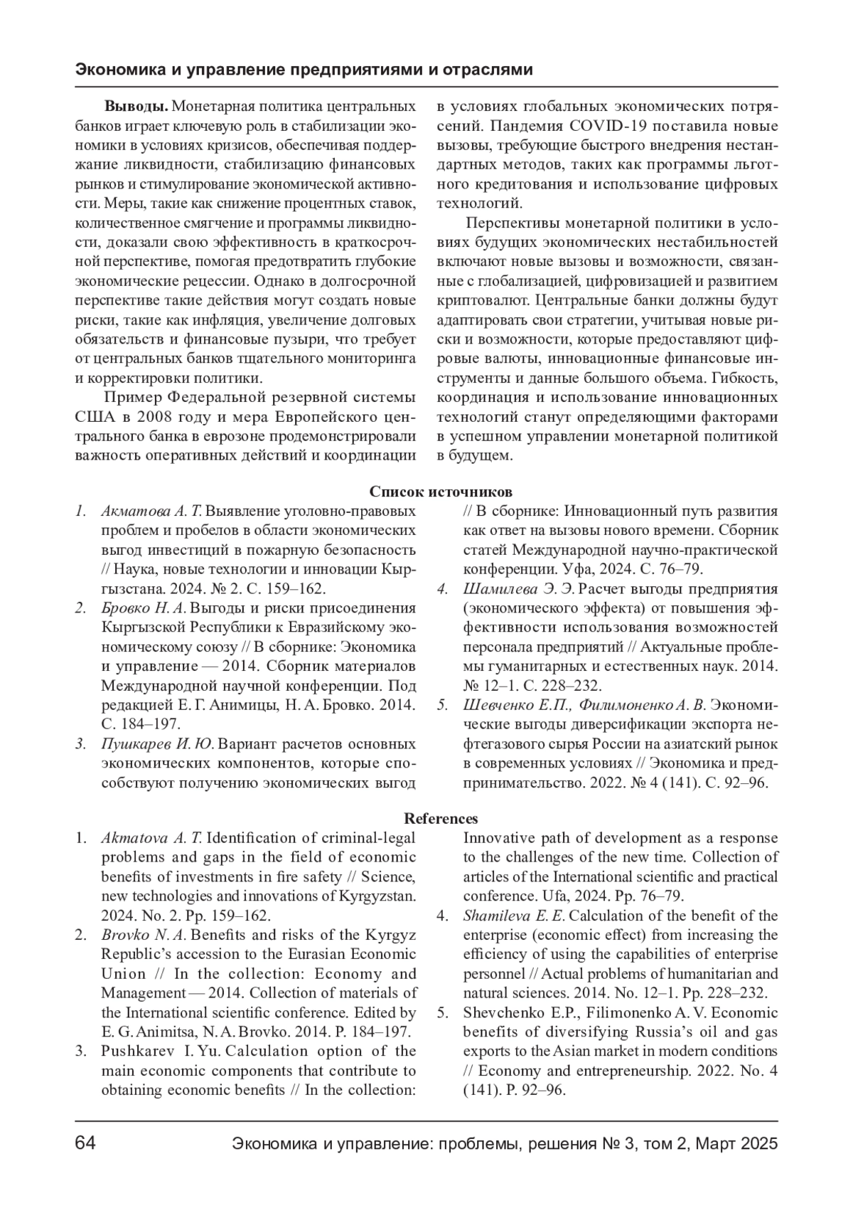 Статья посвящена анализу эффективности монетарной политики центральных банков в условиях экономических кризисов. Рассматриваются ключевые функции центральных банков, особенности их деятельности в условиях нестабильности на финансовых рынках. Особое внимание уделено анализу методов и инструментов, применяемых центральными банками для стабилизации экономики в кризисные периоды, таких как изменение процентных ставок, количественное смягчение и программы кредитования. На основе анализа исторических примеров исследуется влияние этих мер на экономику в краткосрочной и долгосрочной перспективе. В статье также обсуждаются перспективы и вызовы для монетарных властей в условиях новых экономических реалий.
