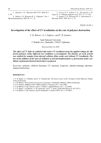 БОБОЕВ Т. Б., ГАФУРОВ С. Д., ИСТАМОВ Ф. Х. ИССЛЕДОВАНИЕ ВЛИЯНИЯ УФ-ОБЛУЧЕНИЯ НА СКОРОСТЬ РАЗРУШЕНИЯ ПОЛИМЕРОВ // ПРИКЛАДНАЯ ФИЗИКА. 2020. № 5
