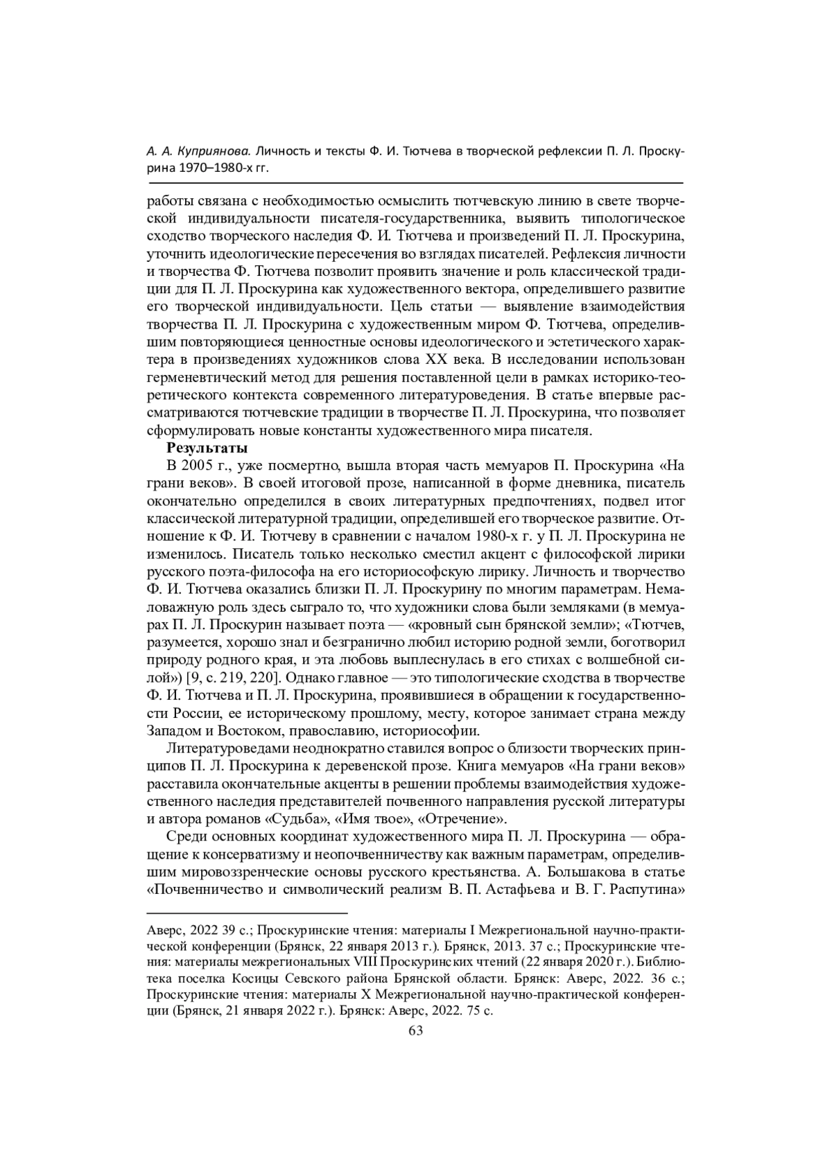 1. Большакова А. Ю. Почвенничество и символический реализм В. П. Астафьева и В. Г. Распутина // Проблемы исторической поэтики. 2023. Т. 21, № 3. С. 303-327. Текст: непосредственный. EDN: ZFCVGC
