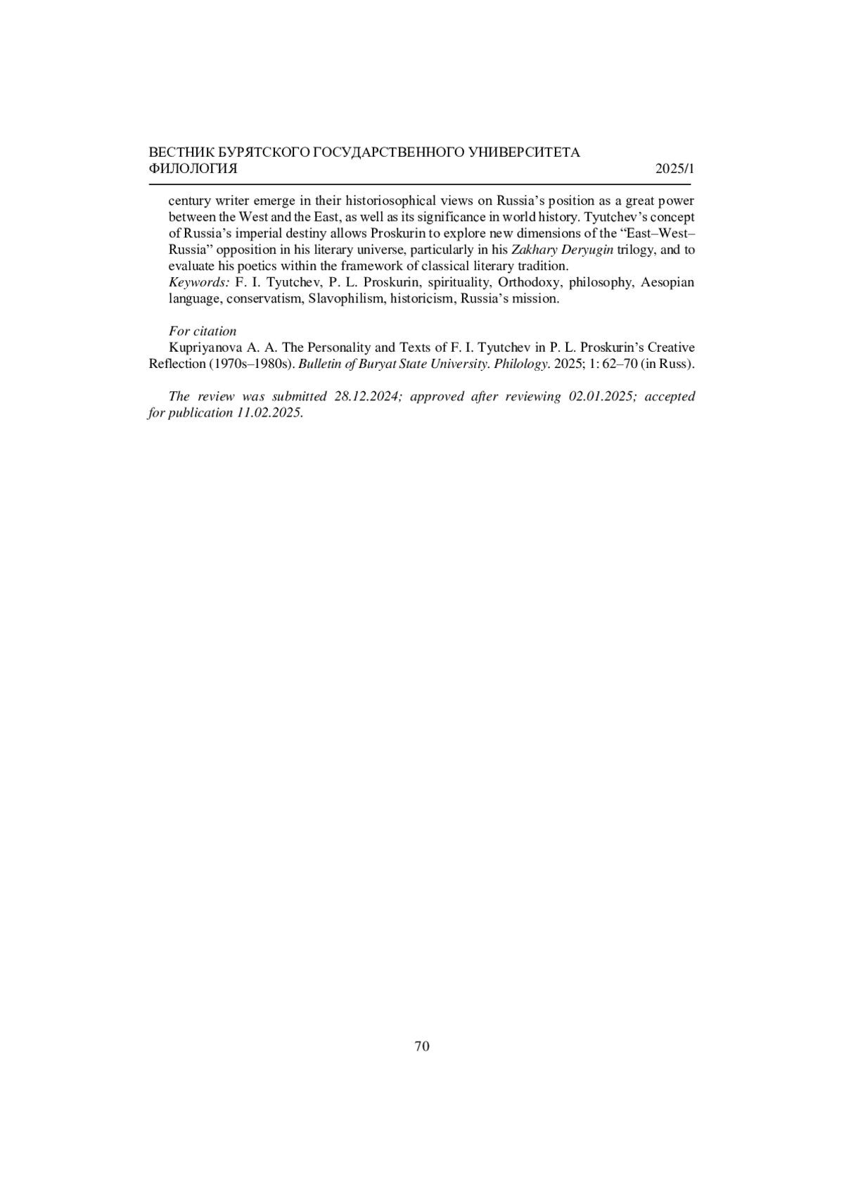 В статье рассматриваются причины возникновения интереса П. Л. Проскурина к личности и текстам Ф. И. Тютчева. Отмечается, что писатель оценивает художественное наследие поэта как воплощение Большой истории, миссии русского народа, провиденциального образа России, бессмертия творчества. П. Л. Проскурин использует различные средства и приемы для презентации личности и поэзии Ф. И. Тютчева: пафосную модальность, эзопов язык, рассмотрение философской лирики поэта в контексте традиции, мотив поэта-пророка. Типологические схождения между взглядами и творчеством поэта ХРХ в. и писателя ХХ в. прослеживаются в их историософских взглядах на положение России как державы между Западом и Востоком, в том, как они понимали значение и роль страны в мировой истории человечества. Обращение к концепции державности России поэта-философа позволяет раскрыть новые грани в оппозиции «Восток - Запад - Россия» в художественном мире автора трилогии о Захаре Дерюгине, оценить его поэтику в контексте развития классической традиции.