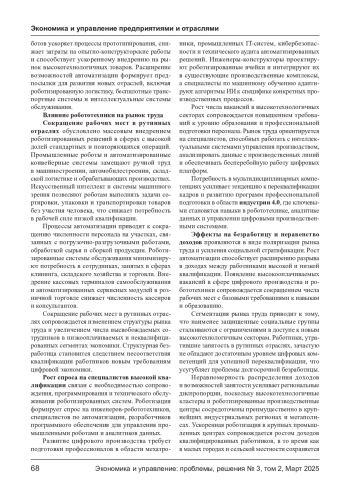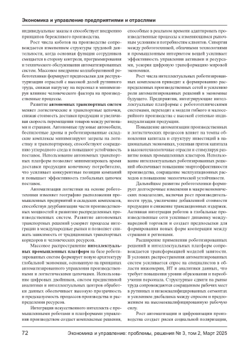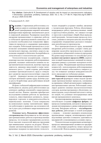 Современная робототехника оказывает масштабное влияние на макроэкономические процессы, формируя новые тренды в производственной и социальной сферах. Внедрение промышленных и сервисных роботов трансформирует структуру рынков труда, повышает производительность и меняет инвестиционные потоки на глобальном уровне. В статье рассматриваются ключевые макроэкономические эффекты роботизации, включая рост эффективности производства, сокращение рабочих мест в рутинных секторах, рост спроса на квалифицированный персонал и изменение структуры международных инвестиций. Особое внимание уделяется вопросам неравномерности роботизации между странами и ее влиянию на глобальную экономическую устойчивость. Обоснованы как положительные, так и потенциально негативные последствия массового внедрения роботизированных технологий для макроэкономических показателей.