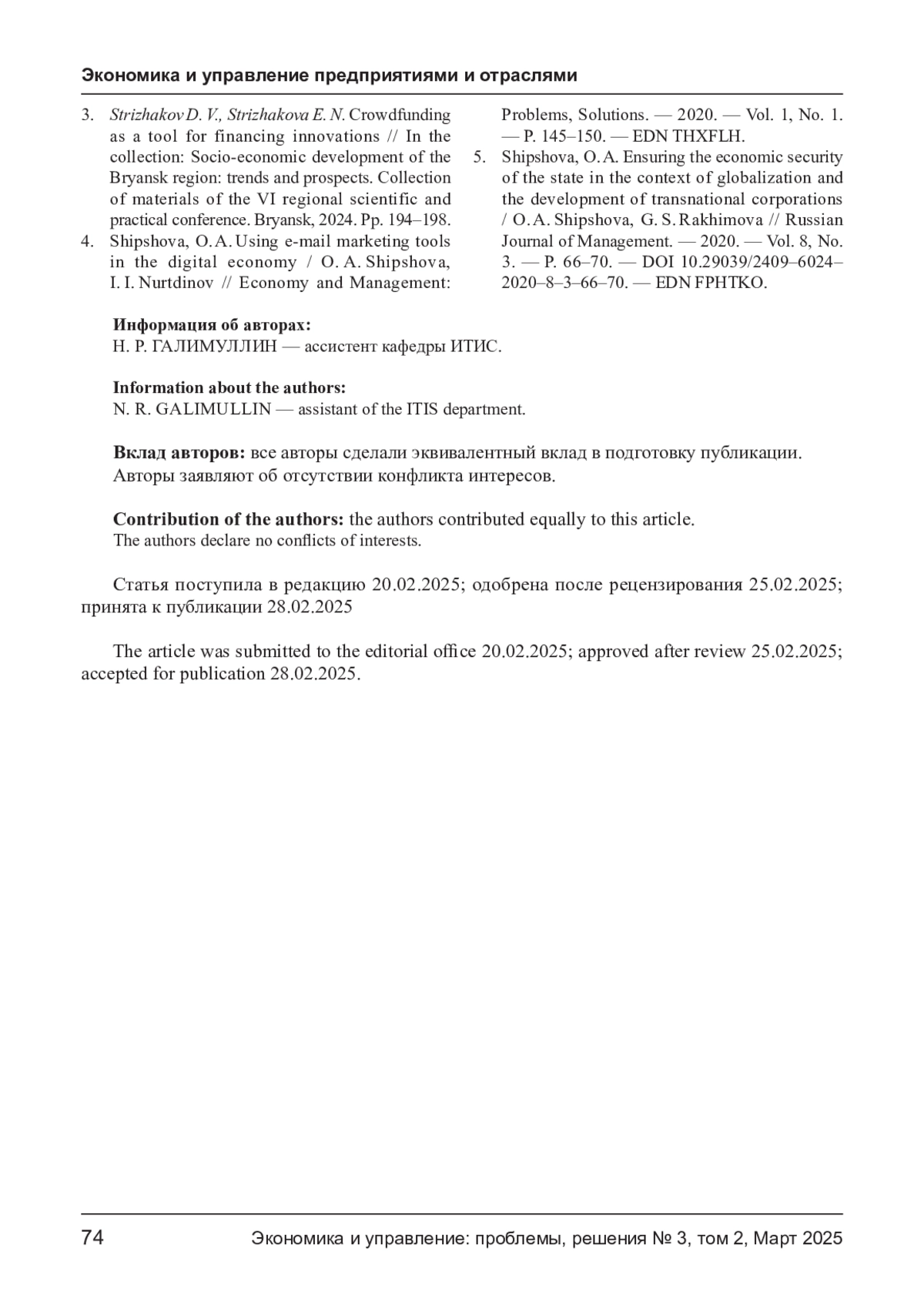 4. Шипшова, О. А. Использование инструментов e-mail маркетинга в цифровой экономике /О. А. Шипшова, И. И. Нуртдинов // Экономика и управление: проблемы, решения. - 2020. -Т. 1, № 1. - С. 145-150. EDN: THXFLH