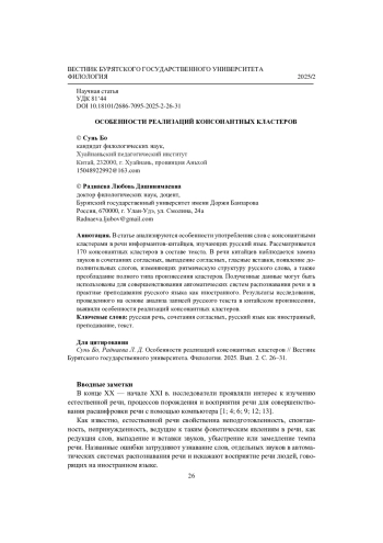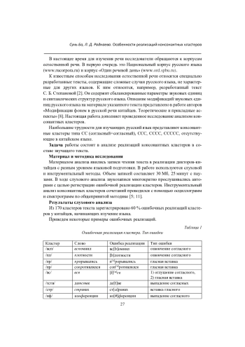 В статье анализируются особенности употребления слов с консонантными кластерами в речи информантов-китайцев, изучающих русский язык. Рассматривается 170 консонантных кластеров в составе текста. В речи китайцев наблюдается замена звуков в сочетаниях согласных, выпадение согласных, гласные вставки, появление дополнительных слогов, изменяющих ритмическую структуру русского слова, а также преобладание полного типа произнесения кластеров. Полученные данные могут быть использованы для совершенствования автоматических систем распознавания речи и в практике преподавания русского языка как иностранного. Результаты исследования, проведенного на основе анализа записей русского текста в китайском произнесении, выявили особенности реализаций консонантных кластеров.