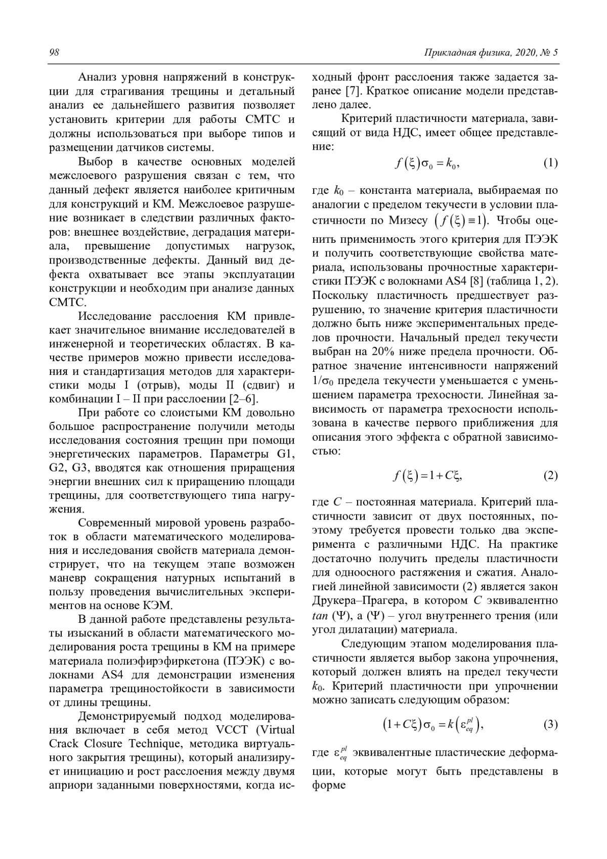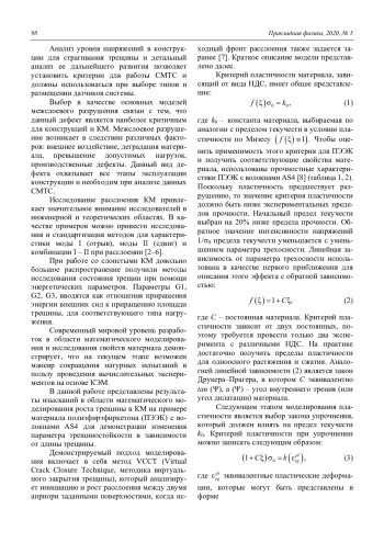 численного моделирования представлено из- * GIIC – характеристика трещиностойкости, энергия страгивания при моде 2 (Дж/м2). менение параметра трещиностойкости при отрыве GIC в зависимости от длины трещины для термопластичного и реактопластичного связующего. На основе полученных результатов можно сделать вывод, что модель хорошо предсказывает GIC и GIIC при зарождении трещины, но затем возможно падение от референсных значений по мере продвижении кончика трещины внутри слоя. Исключением является вариант моделирования GIIC для реактопластичного связующего, когда кончик трещины быстро переместился на границу слоев с ростом GIIC. Стоит отметить, что в качестве референсных значений энергетических параметров брались полученные при продольной ориентации образцов. Представленный вариант моделирования материала и реализация других способов расширения возможностей КЭМ расчетов на прочность напрямую влияет на распространение СМТС с использованием прогнозных методов оценки состояния.