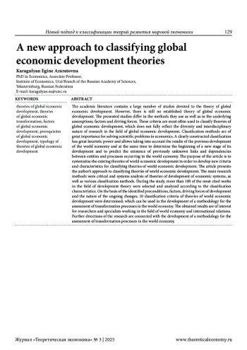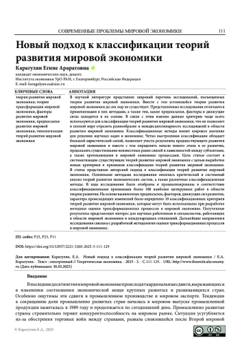 Аннотация. В научной литературе представлен широкий перечень исследований, посвященных теории развития мировой экономики. Вместе с тем устоявшейся теории развития мировой экономики до сих пор не существует. Представленные исследования отличаются применяемыми в них методами, а также тем, какие предпосылки, факторы и движущие силы находятся в их основе. В связи с этим именно данные критерии чаще всего используются для классификации теорий развития мировой экономики, что не позволяет в полной мере отразить разнообразие и междисциплинарность исследований в области развития мировой экономики. Классификационные методы имеют широкое значение для решения научных задач в экономике. Четко выстроенная классификация обладает большой эвристической силой, позволяет учесть результаты предшествующего развития мировой экономики и вместе с тем определить начало нового этапа в ее развитии, предсказать существование неизвестных ранее связей и зависимостей между субъектами, а также протекающими в мировой экономике процессами. Цель статьи состоит в систематизации существующих теорий развития мировой экономики с целью выработки новых критериев и признаков классификации теорий развития мировой экономики. В статье представлен авторский подход к классификации теорий развития мировой экономики. Основными методами исследования являлись критический и системный анализ теорий развития экономических систем, а также различные классификационные методы. В ходе исследования были отобраны и проанализированы в соответствии классификационными признаками более 100 наиболее цитируемых работ в области теории развития. На основе выявленных предпосылок, факторов, движущих сил развития, характера происходящих изменений было определено 10 классификационных критериев теорий развития мировой экономики, которые могут быть использованы при разработке методики оценки трансформационных процессов в мировой экономике. Полученные результаты представляют интерес для научных работников и специалистов, работающих в области мировой экономики и международных отношений. Дальнейшие направления исследования связаны с разработкой методологии оценки трансформационных процессов в мировой экономике.