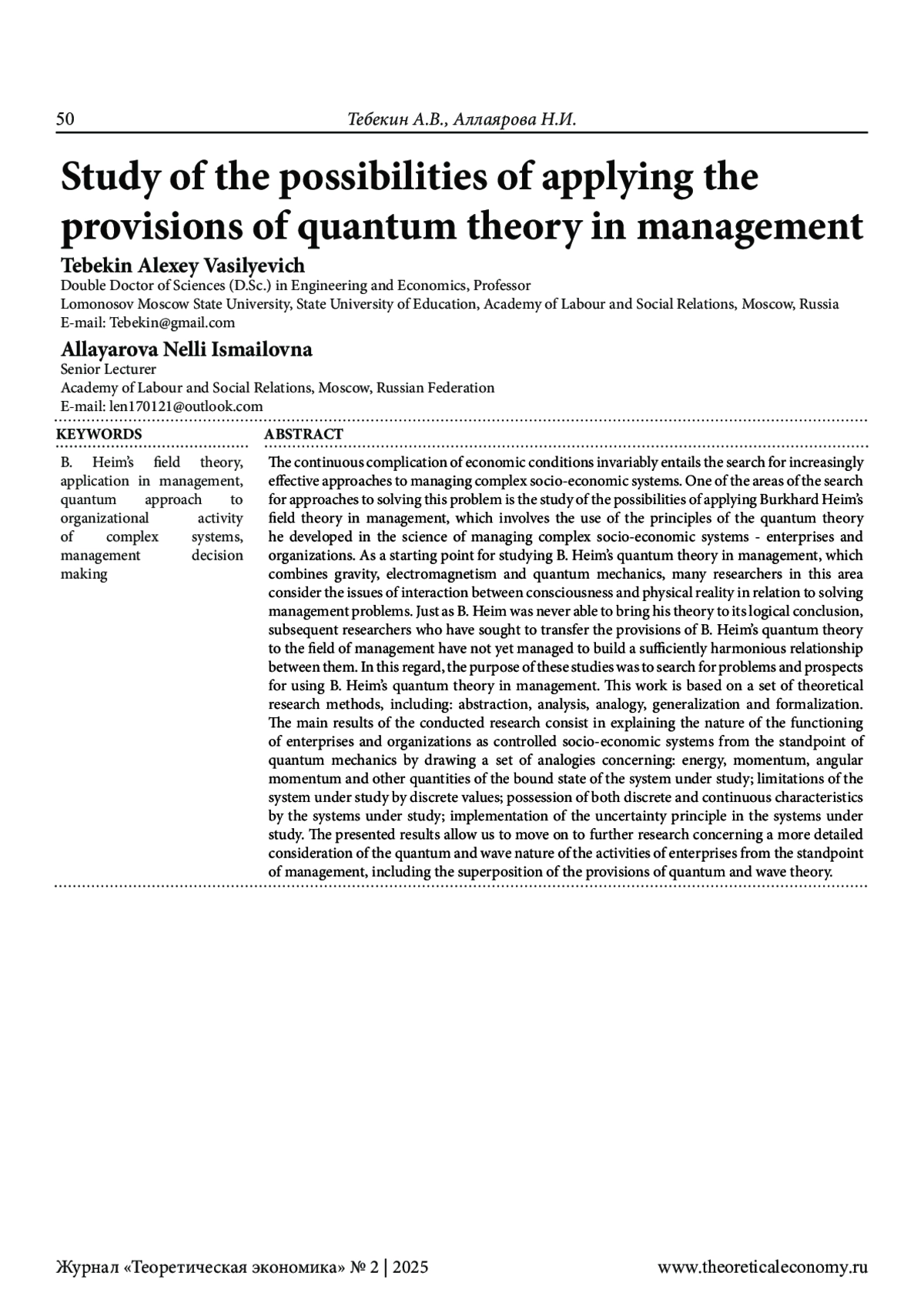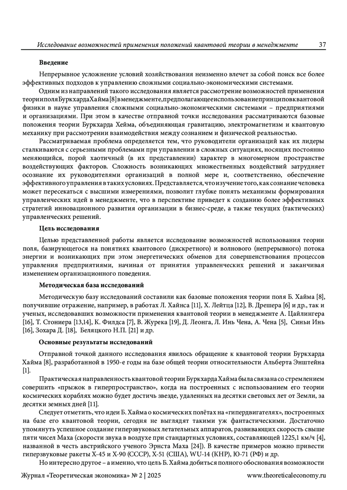 Непрерывное усложнение условий хозяйствования неизменно влечет за собой поиск все более эффективных подходов к управлению сложными социально-экономическими системами. Одним из направлений такого исследования является рассмотрение возможностей применения теории поля Буркхарда Хайма [8] в менеджменте, предполагающее использование принципов квантовой физики в науке управления сложными социально-экономическими системами – предприятиями и организациями. При этом в качестве отправной точки исследования рассматриваются базовые положения теории Буркхарда Хейма, объединяющая гравитацию, электромагнетизм и квантовую механику при рассмотрении взаимодействия между сознанием и физической реальностью.