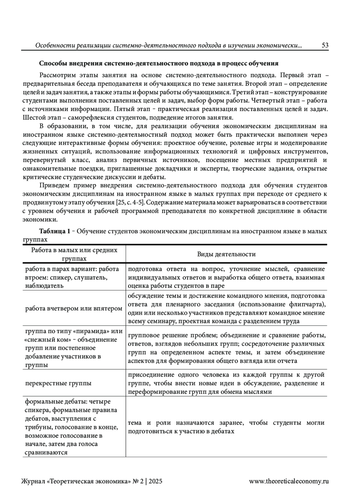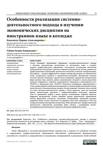 Статья посвящена обоснованию применения системно-деятельностного подхода в обучении экономическим дисциплинам на иностранном языке в условиях среднего профессионального образования. Актуальность исследования обусловлена необходимостью интеграции студентов в мировую экономическую систему, развития их профессиональных компетенций, критического мышления и навыков самоорганизации. Цель работы - доказать эффективность данного подхода через анализ его теоретических основ, исторического развития и практической реализации. Методология включает изучение научной литературы, педагогическое наблюдение, применение интерактивных форм (ролевые игры, проекты, дебаты, моделирование ситуаций) и анализ результатов контроля успеваемости студентов специальностей «Экономика и бухгалтерский учет» (38.02.01) и «Банковское дело» (38.02.07). Результаты исследования, представленные в статье, демонстрируют положительную динамику в освоении профессиональной лексики, аналитических и коммуникативных навыков. Авторы выделяют ключевые этапы занятий на основе системно-деятельностного подхода, а также трудности, такие как языковой барьер, межкультурная адаптация и междисциплинарная интеграция, предлагая пути их преодоления (работа в малых группах, использование открытых вопросов, цифровых инструментов). Особое внимание уделено практическим упражнениям: анализу финансовой отчетности, налоговому планированию, управлению рисками, разработке бизнес-планов. Результаты исследования могут быть применены в СПО для совершенствования преподавания дисциплины «Иностранный язык в профессиональной деятельности». Перспективы дальнейших работ связаны с расширением научно-исследовательской деятельности студентов и изучением зарубежного опыта.