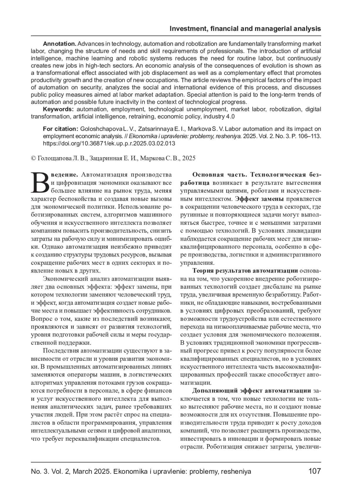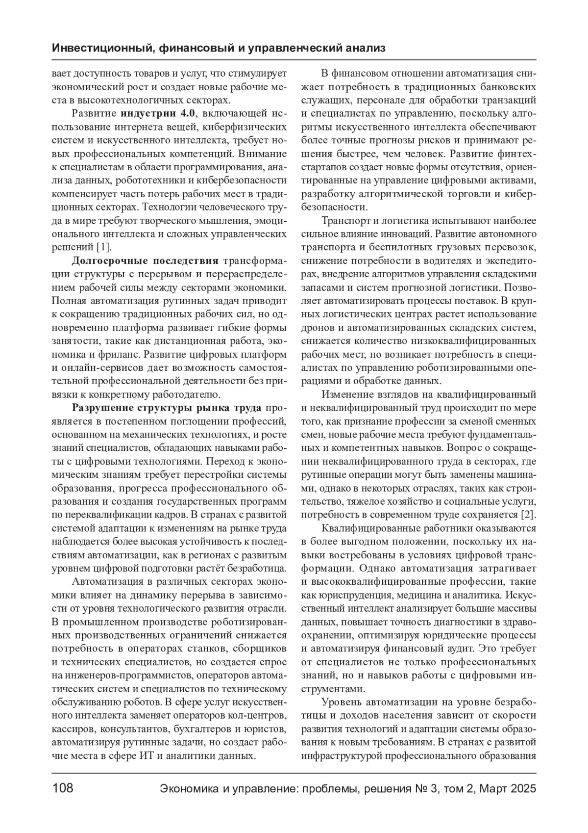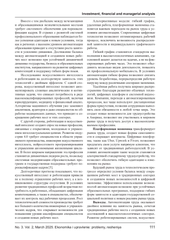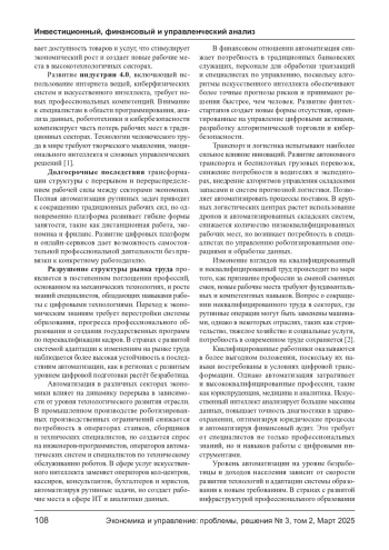 Развитие технологий, автоматизации и роботизации коренным образом трансформирует рыночный труд, изменяя структуру потребностей и потребности в квалификации специалистов. Внедрение искусственного интеллекта, машинного обучения и роботизированных систем снижает потребность в рутинном труде, но постоянно создает новые рабочие места в высокотехнологичных секторах. Экономический анализ последствий эволюции проявляется как эффект преобразования, связанный с вытеснением рабочих мест, а также дополняющий эффект, способствующий росту производительности и созданию новых профессий. В статье рассматриваются эмпирические факторы влияния автоматизации на уровень безопасности, анализируются социальные и международные данные этого процесса, а также обсуждаются меры государственной политики, направленные на адаптацию рынка труда. Особое внимание уделяется долгосрочным тенденциям автоматизации и возможному будущему бездействию в условиях технологического прогресса.