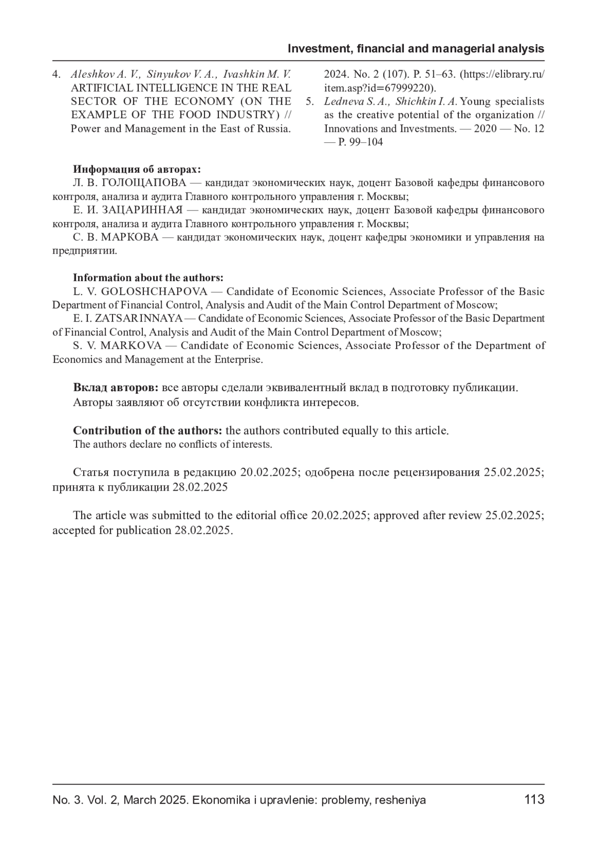 4. Алешков А. В., Синюков В. А., Ивашкин М. В. ИСКУССТВЕННЫЙ ИНТЕЛЛЕКТ В РЕАЛЬНОМ СЕКТОРЕ ЭКОНОМИКИ (НА ПРИМЕРЕ ПИЩЕВОЙ ИНДУСТРИИ) // Власть и управление на Востоке России. 2024. № 2 (107). С. 51-63. (item.asp?id=67999220). EDN: LVZVTN
