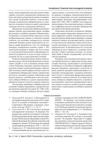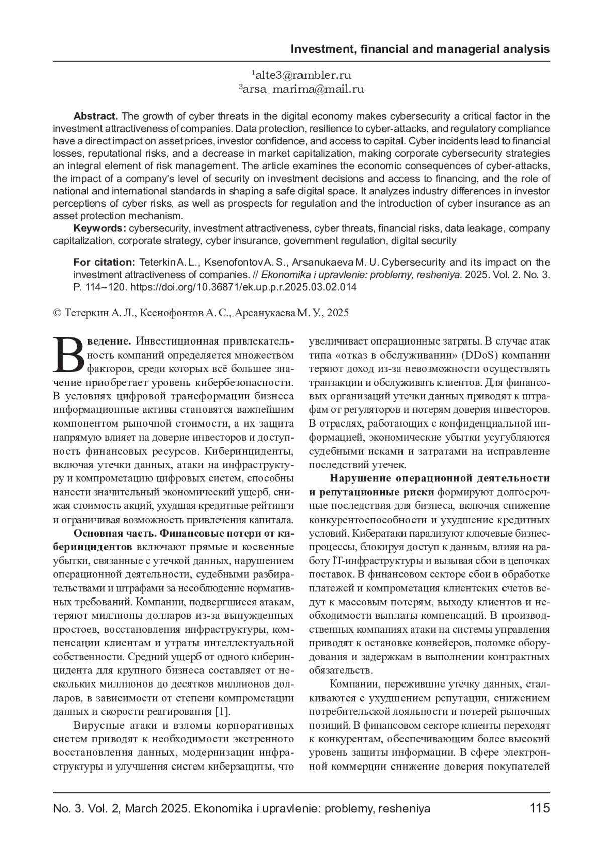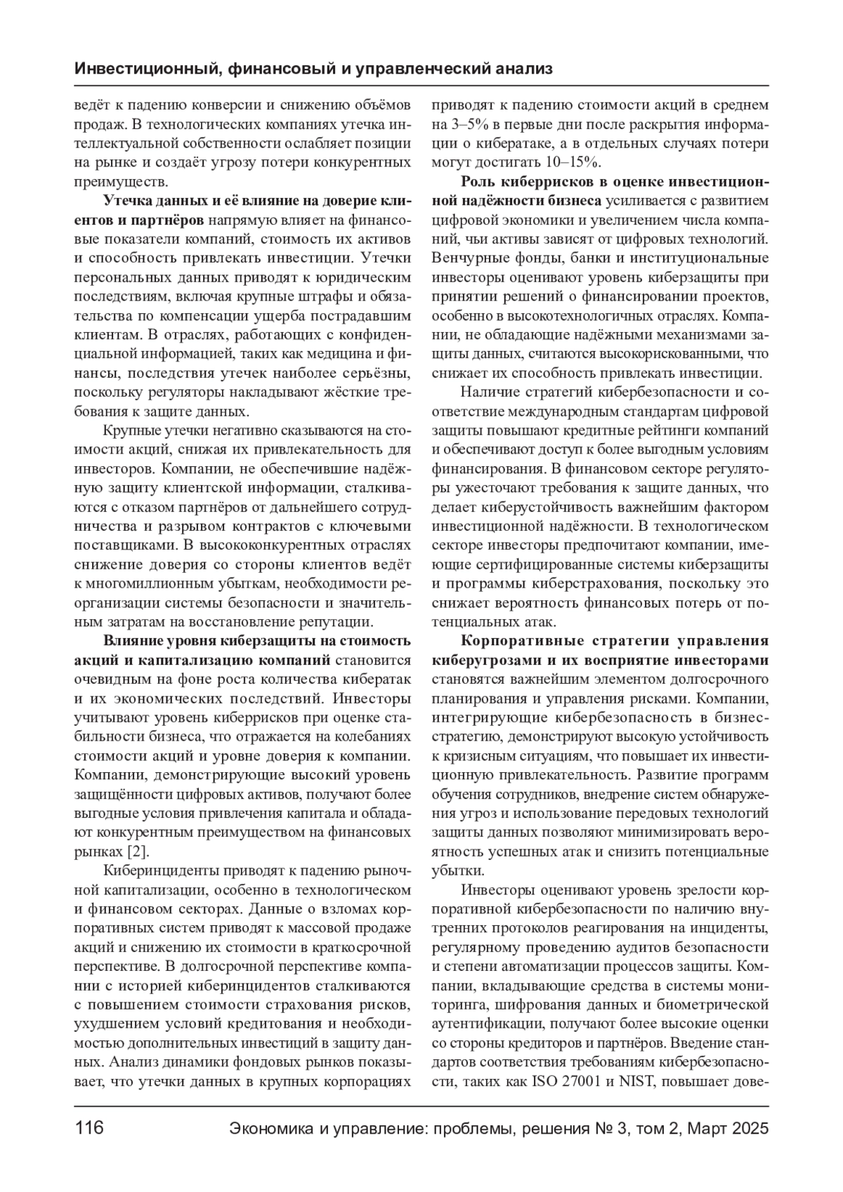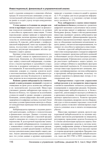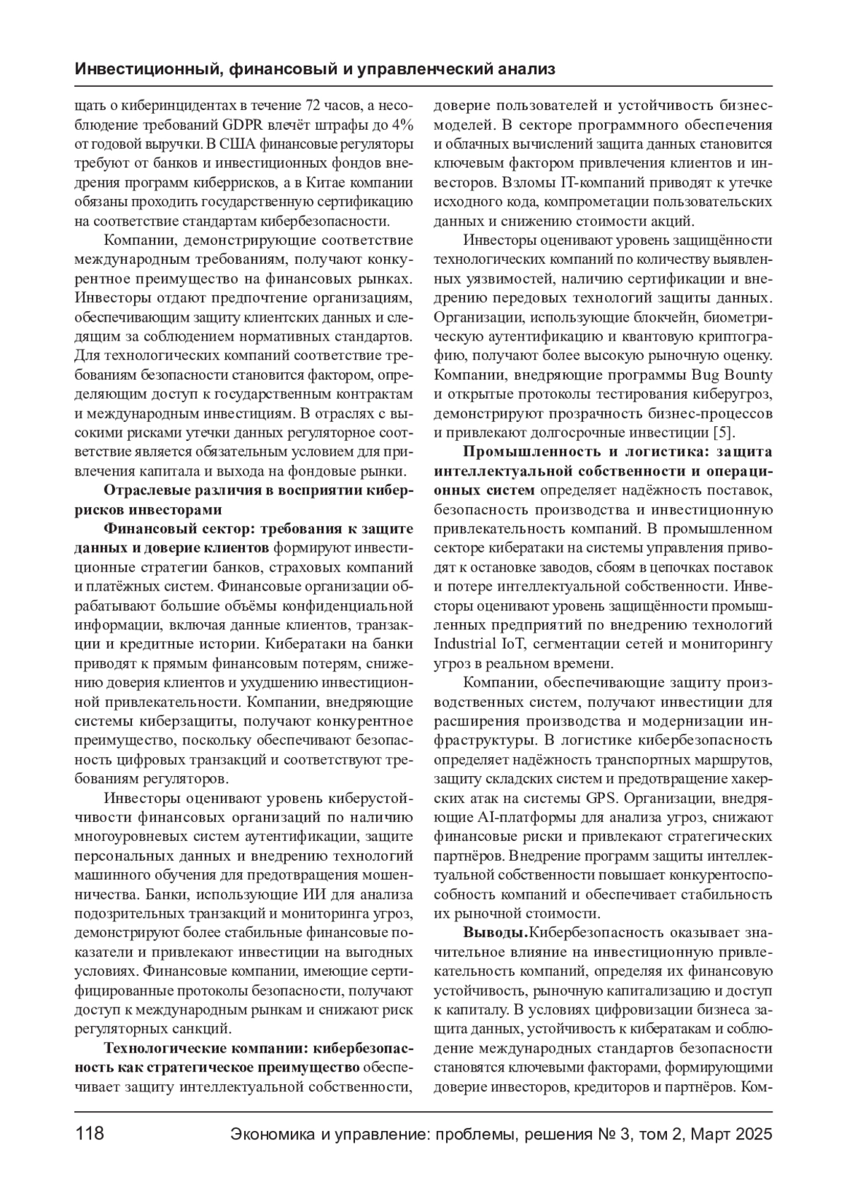 Рост киберугроз в цифровой экономике делает кибербезопасность критическим фактором инвестиционной привлекательности компаний. Защита данных, устойчивость к кибератакам и соответствие нормативным требованиям оказывают непосредственное влияние на стоимость активов, уровень доверия инвесторов и доступ к капиталу. Киберинциденты приводят к финансовым потерям, репутационным рискам и снижению рыночной капитализации, что делает корпоративные стратегии в сфере кибербезопасности неотъемлемым элементом управления рисками. В статье рассматриваются экономические последствия кибератак, влияние уровня защищённости компании на инвестиционные решения и доступ к финансированию, а также роль государственных и международных стандартов в формировании безопасного цифрового пространства. Анализируются отраслевые различия в восприятии киберрисков инвесторами, а также перспективы регулирования и внедрения киберстрахования как механизма защиты активов.