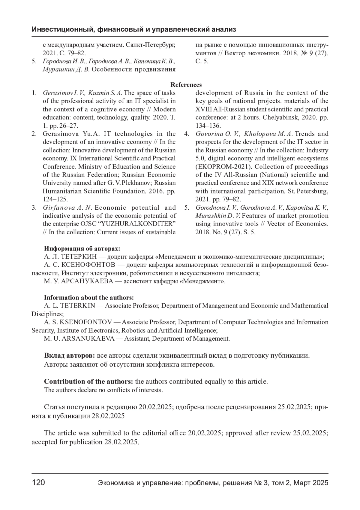 4. Говорина О.В., Холопова М.А.Тенденции и перспективы развития ИТ-сектора в экономике россии // В сборнике: Индустрия 5.0, цифровая экономика и интеллектуальные экосистемы (ЭКОПРОМ-2021). Сборник трудов IV Всероссийской (Национальной) научно-практической конференции и XIX сетевой конференции с международным участием. Санкт-Петербург, 2021. С. 79-82. EDN: QZDKXR