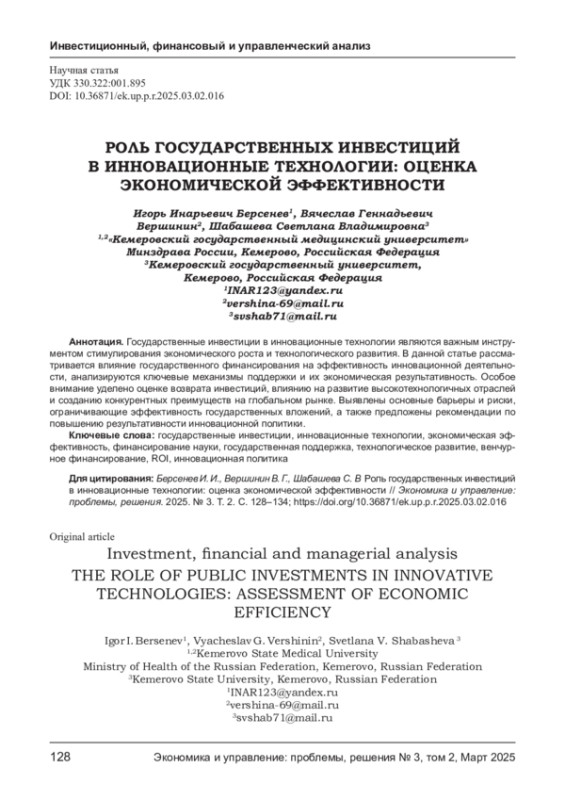 Государственные инвестиции в инновационные технологии являются важным инструментом стимулирования экономического роста и технологического развития. В данной статье рассматривается влияние государственного финансирования на эффективность инновационной деятельности, анализируются ключевые механизмы поддержки и их экономическая результативность. Особое внимание уделено оценке возврата инвестиций, влиянию на развитие высокотехнологичных отраслей и созданию конкурентных преимуществ на глобальном рынке. Выявлены основные барьеры и риски, ограничивающие эффективность государственных вложений, а также предложены рекомендации по повышению результативности инновационной политики.