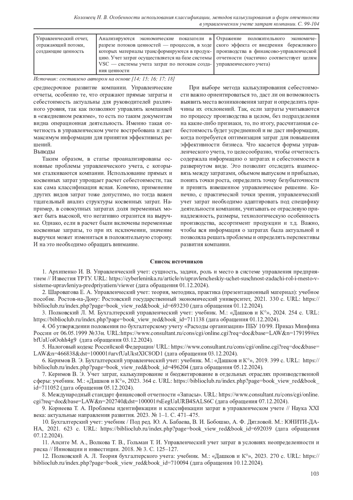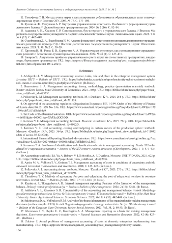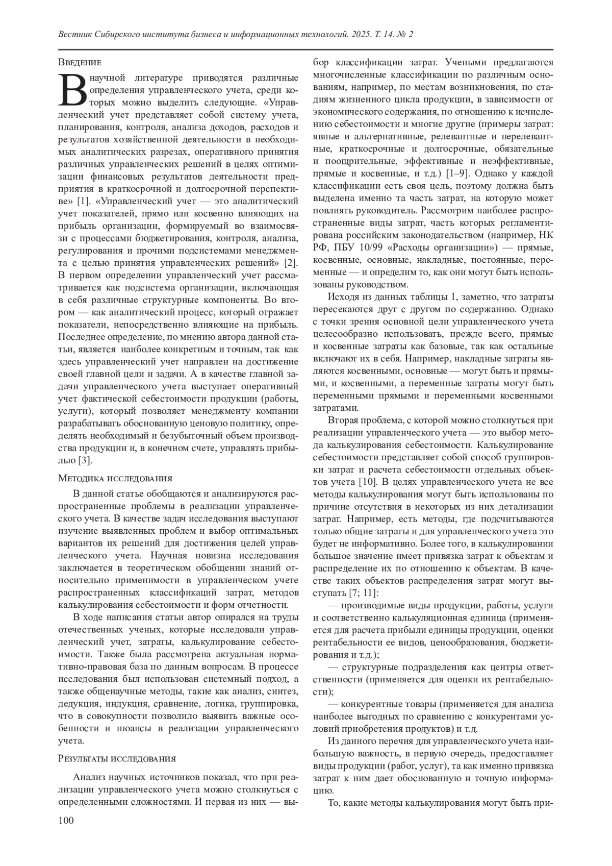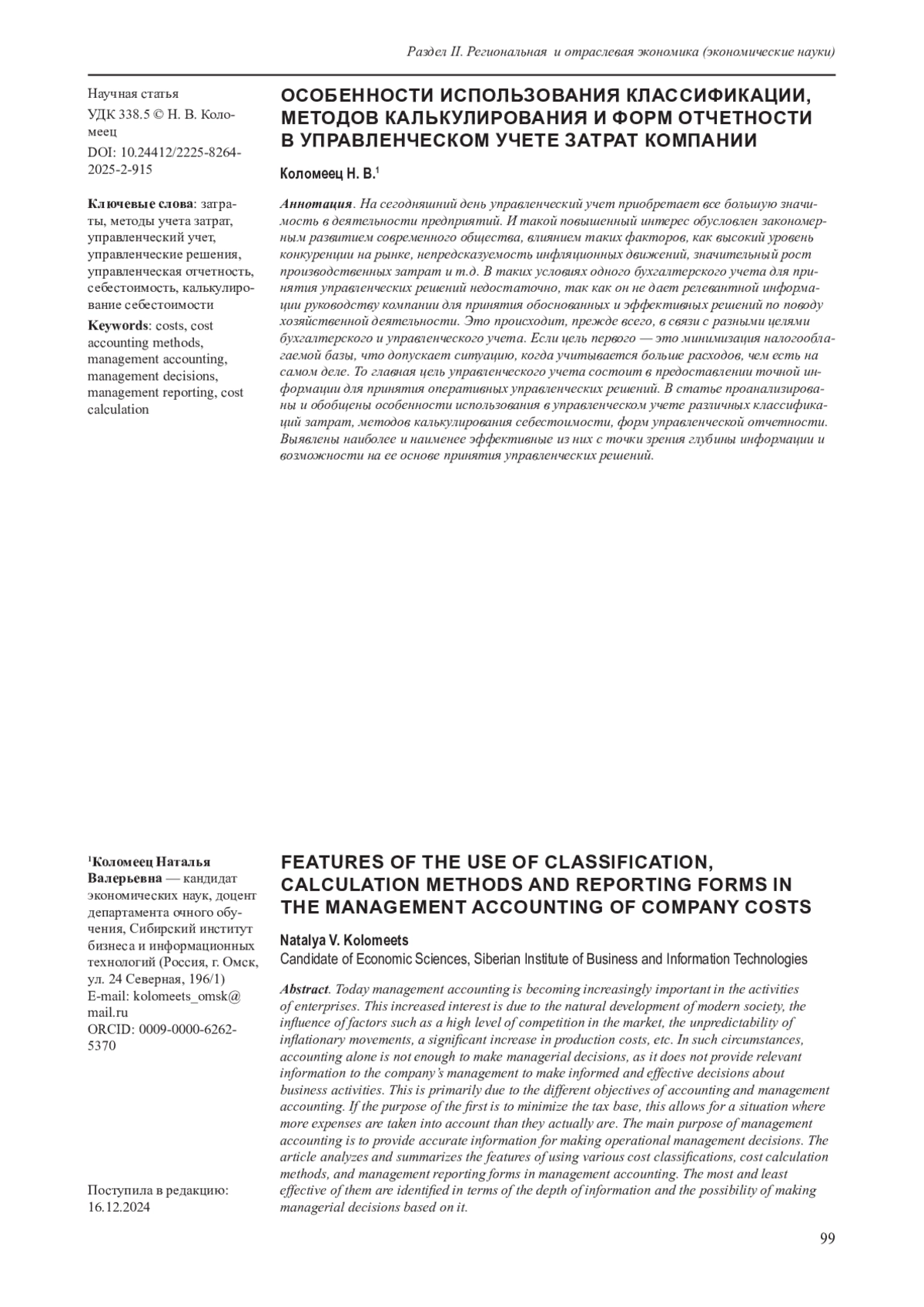 КОЛОМЕЕЦ Н. В. ОСОБЕННОСТИ ИСПОЛЬЗОВАНИЯ КЛАССИФИКАЦИИ, МЕТОДОВ КАЛЬКУЛИРОВАНИЯ И ФОРМ ОТЧЕТНОСТИ В УПРАВЛЕНЧЕСКОМ УЧЕТЕ ЗАТРАТ КОМПАНИИ // ВЕСТНИК СИБИРСКОГО ИНСТИТУТА БИЗНЕСА И ИНФОРМАЦИОННЫХ ТЕХНОЛОГИЙ. 2025. ТОМ 14, № 2