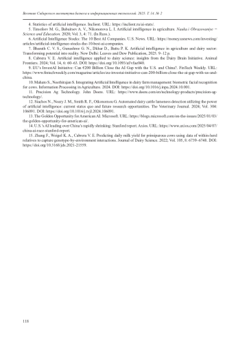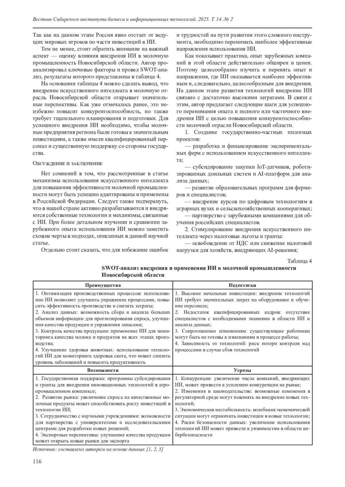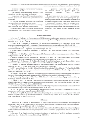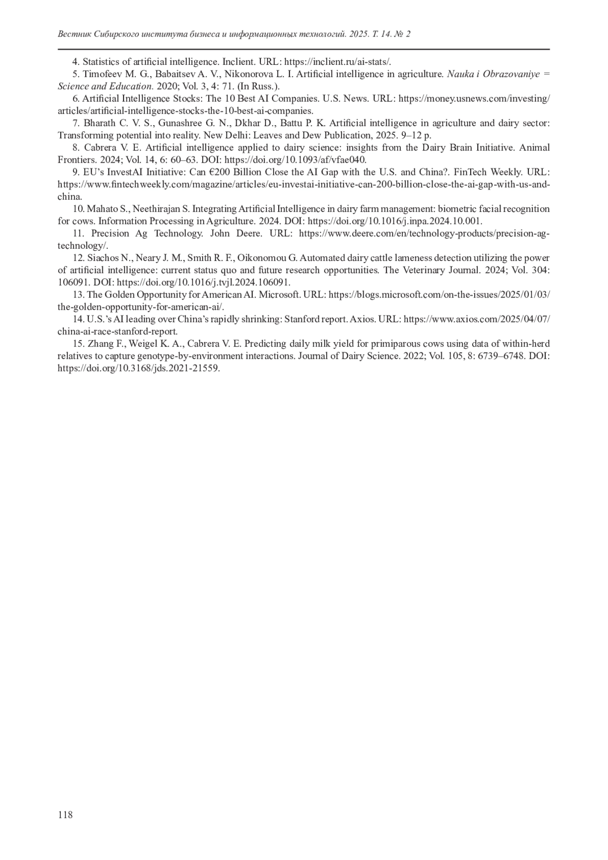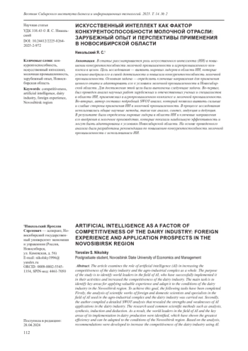 НИКОЛЬСКИЙ Я. С. ИСКУССТВЕННЫЙ ИНТЕЛЛЕКТ КАК ФАКТОР КОНКУРЕНТОСПОСОБНОСТИ МОЛОЧНОЙ ОТРАСЛИ: ЗАРУБЕЖНЫЙ ОПЫТ И ПЕРСПЕКТИВЫ ПРИМЕНЕНИЯ В НОВОСИБИРСКОЙ ОБЛАСТИ // ВЕСТНИК СИБИРСКОГО ИНСТИТУТА БИЗНЕСА И ИНФОРМАЦИОННЫХ ТЕХНОЛОГИЙ. 2025. ТОМ 14, № 2
